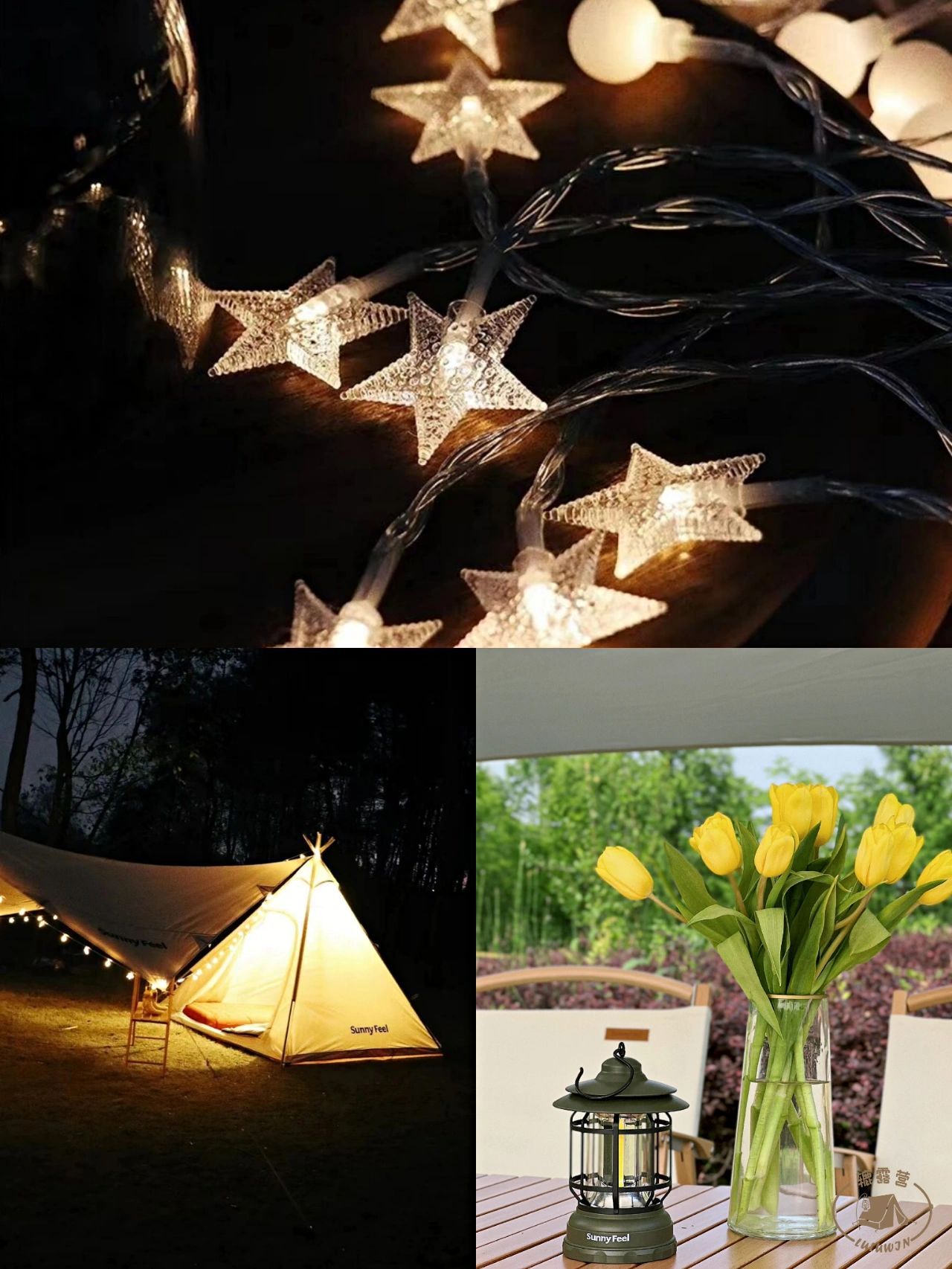 灯具篇Sunnyfeel氛围灯串:防水灯珠,续航时间很长,亮度高,夏季挂在帐篷、天幕上氛围感超绝!Sunnyfeel营地氛围灯:复古造型,放射性氛围光,极具露营仪式感,随手一拍,超级出片。防水防尘,刮风下雨也不怕。。