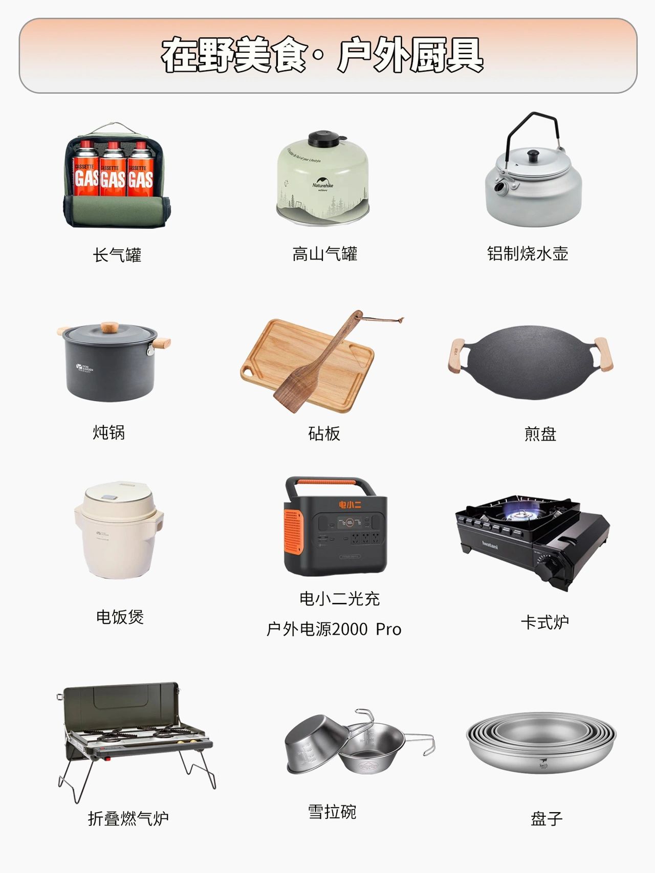 2.在野美食——户外厨具卡式炉:主要用于烧水煮饭搭配长气罐长气罐:超市、小卖部均有卖高山气罐:燃烧效率更高,搭配大功率炉具使用,需网购烧水壶:1L左右为宜,铝制烧水更快汤锅:煮面、煮火锅砧板:方便切菜煎盘:户外煎、烤肉效果很好,不沾,记得保养锅面电饭煲:搭配户外电源使用,一锅稳定、不糊锅的米饭折叠双炉头:做饭效率更高,可边煮边烤雪拉碗:取代一次性碗,更健康盘子:不锈钢、塑料、钛材质均可