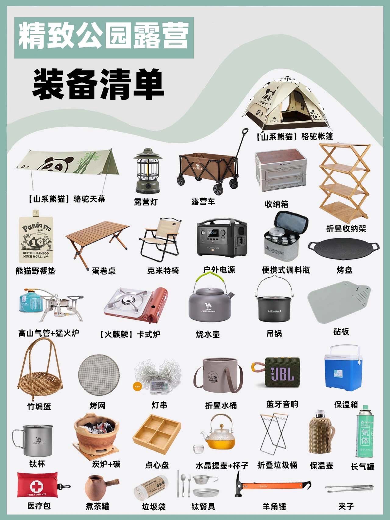 一份详细版公园露营装备清单,快收好,还有最近超火的围炉装备噢。