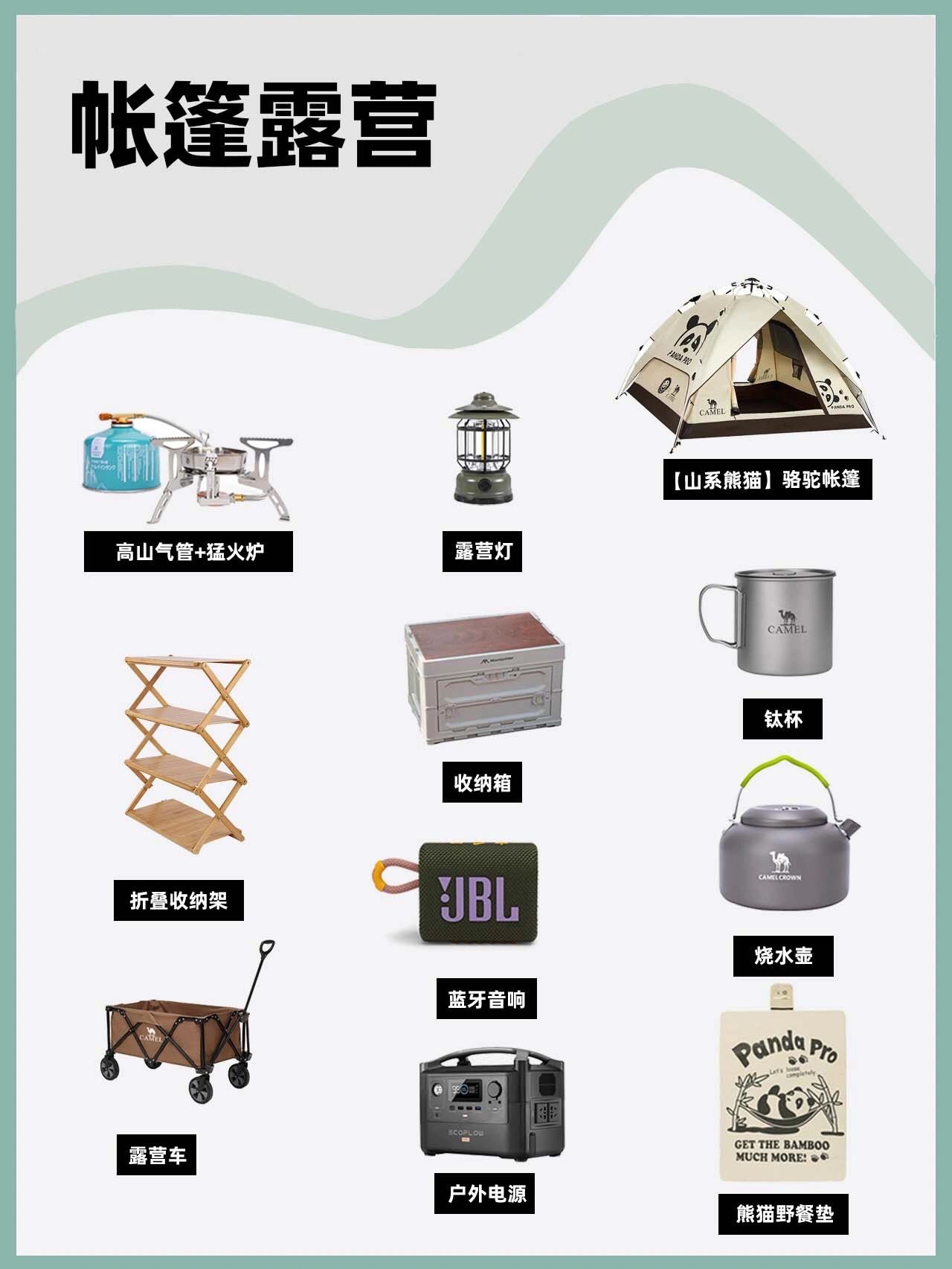 骆驼帐篷、高山气罐、猛火炉、收纳箱、营地车、野餐垫、露营灯、折叠收纳架、户外电源、蓝牙音响、钛杯、烧水壶