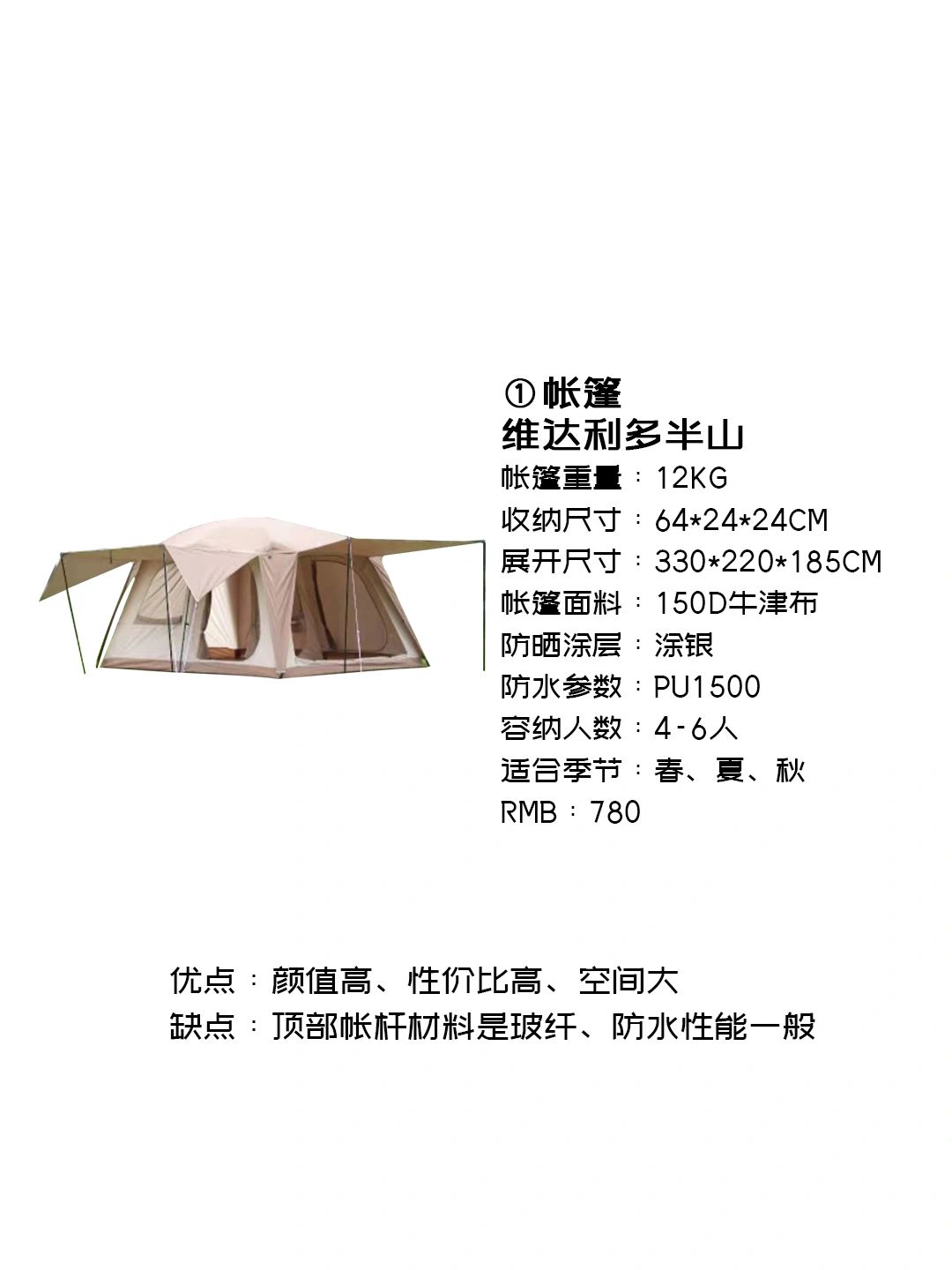 1帐篷维达利多半山(新品)优点颜值高、性价比高,、收纳尺寸短了,之前我用别墅帐的时候就是因为收纳尺寸太长才把他换掉的。缺点顶部帐杆变成玻纤的了,会没有铝合金那么牢固