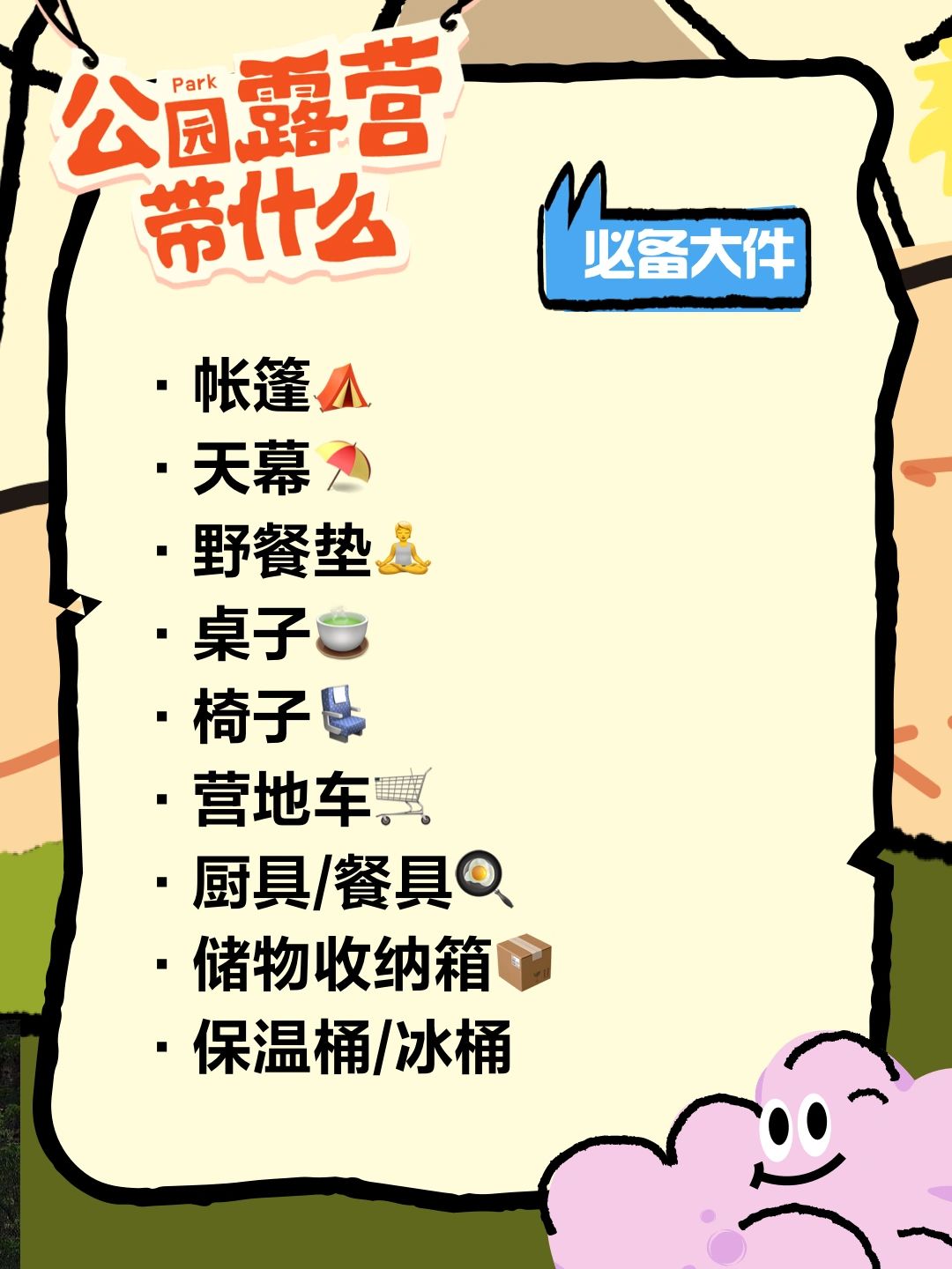 【后勤保障类】亲子幸福小时刻,最担心孩子磕磕碰碰,或者被蚊虫叮咬,备上急救防护物品,有备无患更安心,不会破坏美丽心情~◆急救箱◆充电宝◆垃圾袋◆驱蚊水◆干湿纸巾-人就应该呆在没有天花板的地方,闲暇时去公园露营吧~别再费劲纠结带什么了,这份保姆级清单拿去用,让你出门再也不落东西,尽情享受户外欢喜时光!
