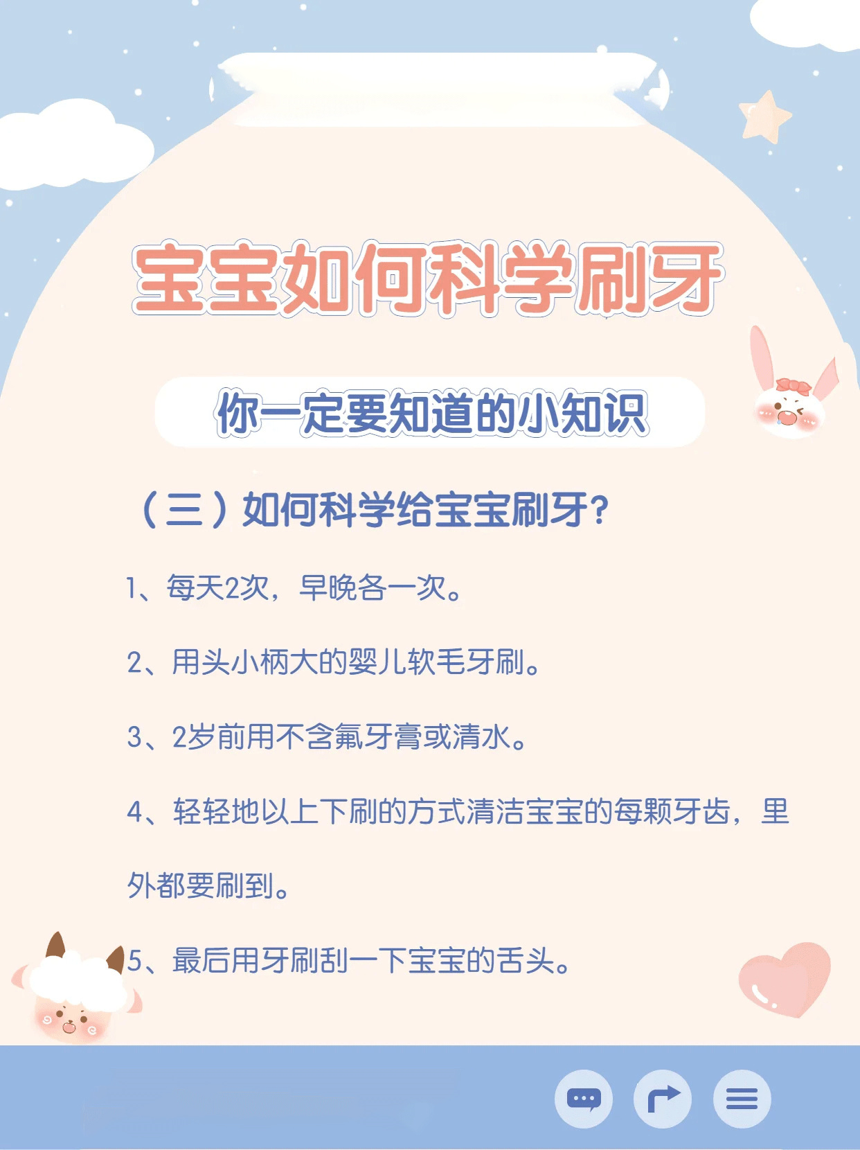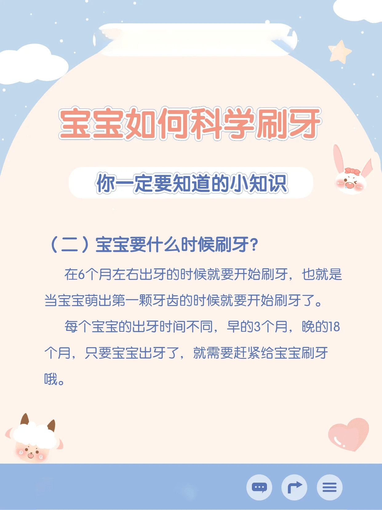 💁‍♀️其实在0-6个月宝宝吃奶的时候,就应该有意识的去培养孩子的口腔卫生。 不要让宝宝含着乳头或者奶瓶睡觉 如果是吃配方奶粉的宝宝,奶后一口稳水权当“漱口”的作用了。 ✅当宝宝第一颗乳牙长出来的时候,就应该开始给宝宝正式的刷牙了。 ❌因为如果乳牙护理不当,对宝宝的发音和恒牙生长都有很大影响。 🌈刷牙的好习惯要从小养成。 在孩子长了第一颗牙之后就应该开始保养,不能等到孩子能够自己刷牙后再开始 更不能等到孩子的乳牙都换掉之后,这样就晚了⚠️ 因为即使在只能喝奶的时候,奶水里也有糖分在侵蚀着宝宝的乳牙 所以要想宝宝有一口好牙就要从小开始保护它❤️