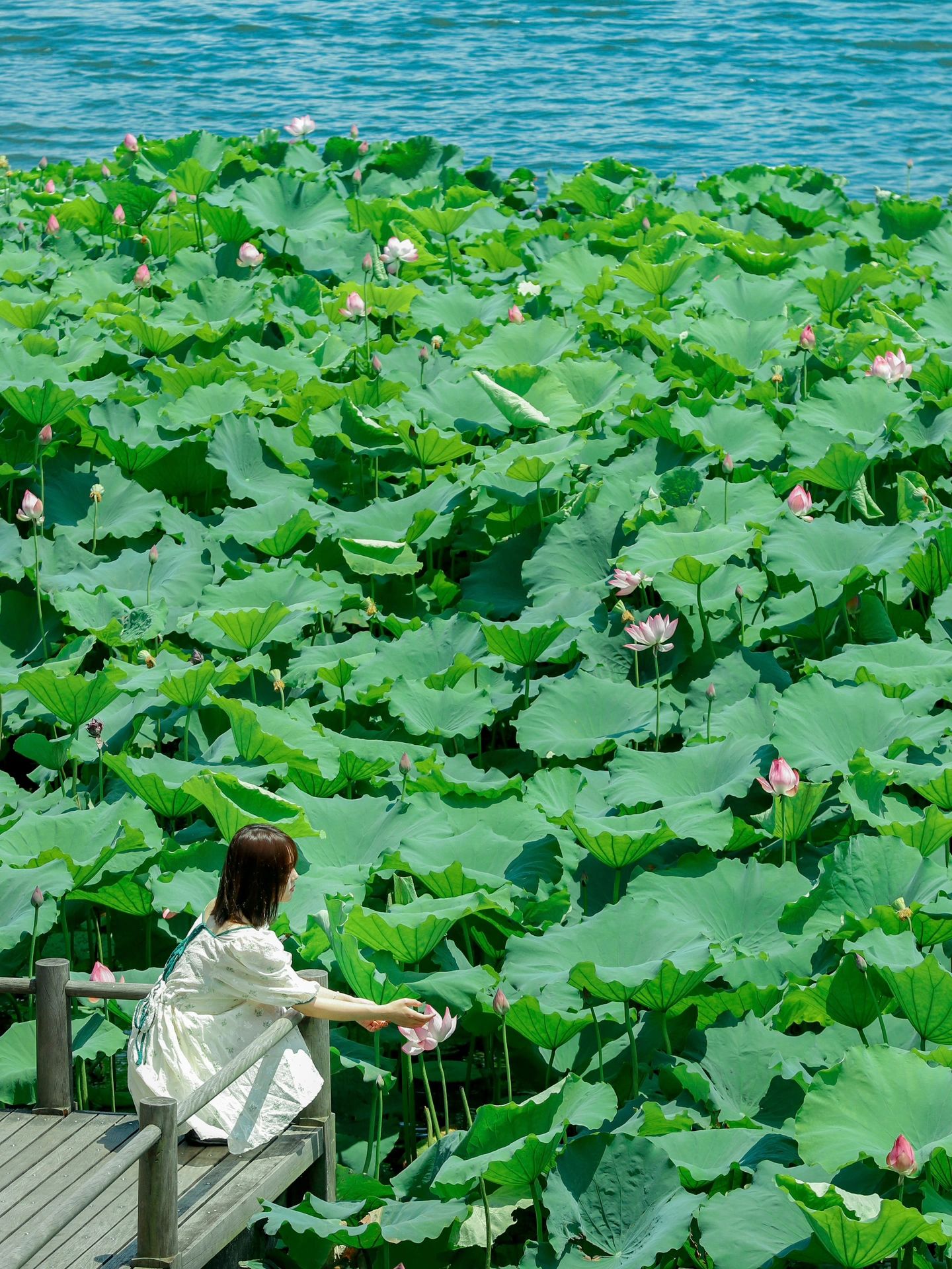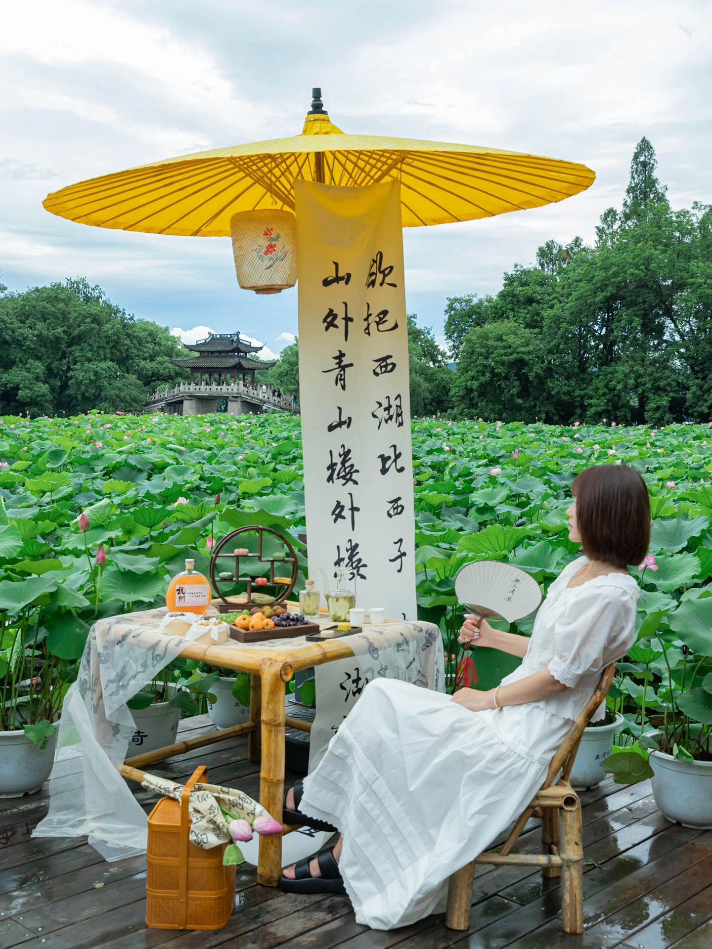 曲院风荷里闹钟取静。可喝茶吃饭躲雨,坐在石栏上感受被荷花包围