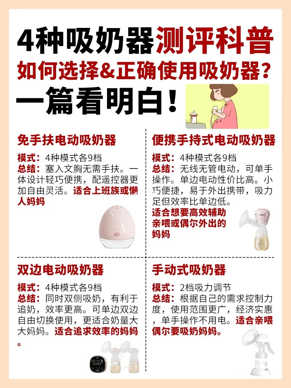 ⭕️市面上常见的吸奶器有以下4种类型: