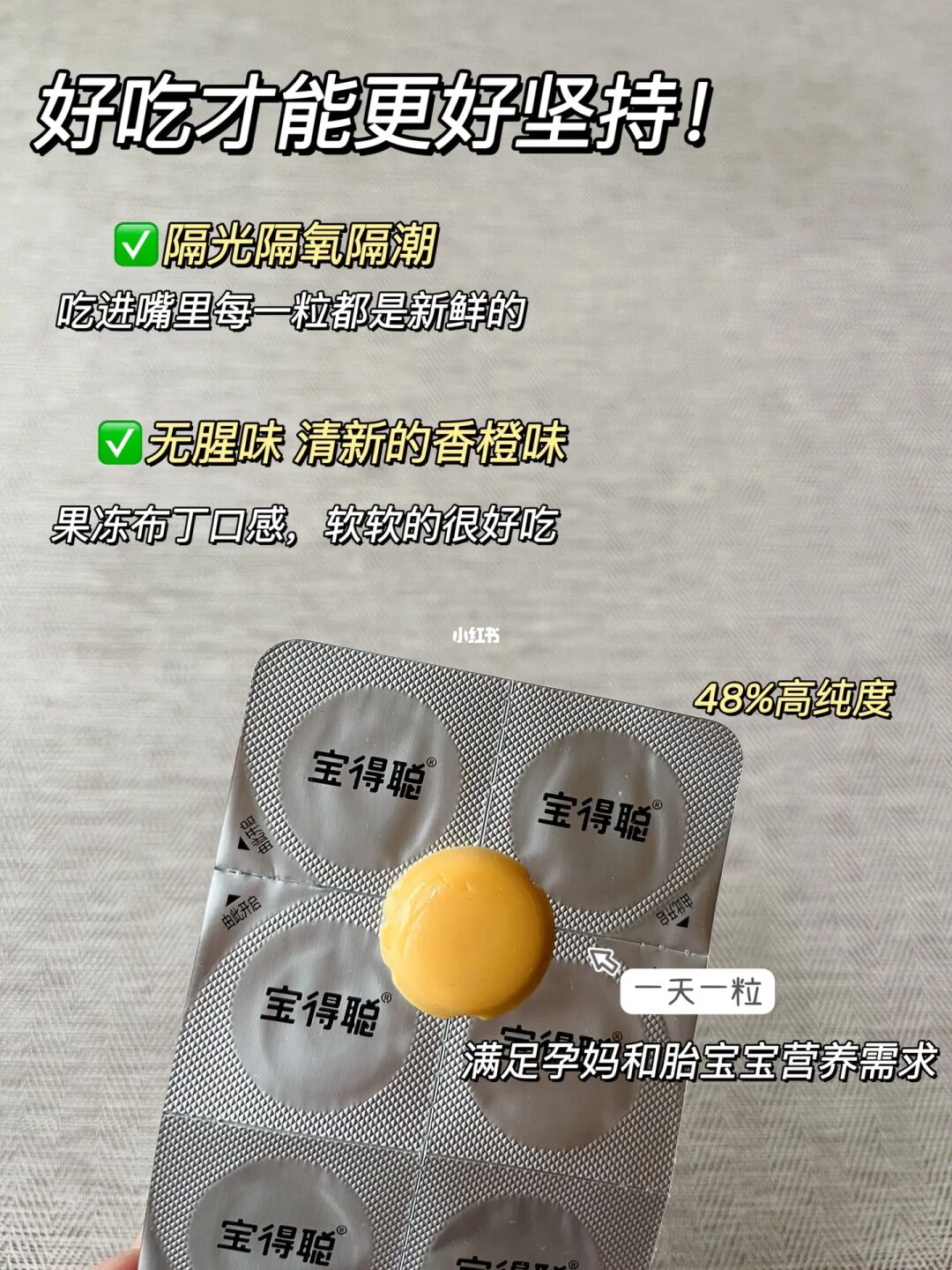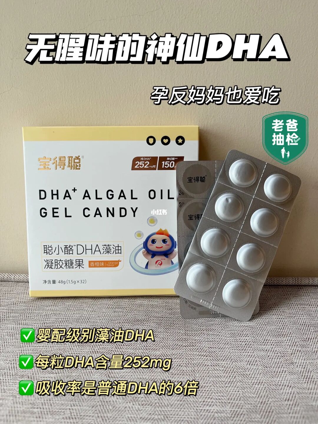 DHA俗称脑黄金,是怀孕期胎儿大脑和眼睛非常重要的脂肪酸,一般从孕3月开始补充。建议每天补充200-300mg[飞吻R]通常情况下食补是不足以满足日常需求,所以一般额外补充DHA。之前做了很多功课,孕期选的就是润科宝得聪孕妇dha藻油❤️润科是国内婴配奶粉DHA供应商,而且他们家的藻油是达到了婴配标准的,更适合中国妈妈、宝宝吃。最近又种草了宝得聪的这款聪小酪dha,是通过老爸评测抽检推荐的,口感和果冻布丁一样,软软QQ的,更重要的是完全没有腥味[气球R]孕吐、怕腥的妈妈可以闭眼选这款!!配料安全,DHA含量纯度也特别高,一粒有252mg DHA,48%高纯度,完全满足孕妈每日摄入需求。每粒含有超10亿小分子,吸收率也是普通dha的6倍!孕妈也非常好吸收。很贴心的是独立包装,卫生干净,外出时方便携带。