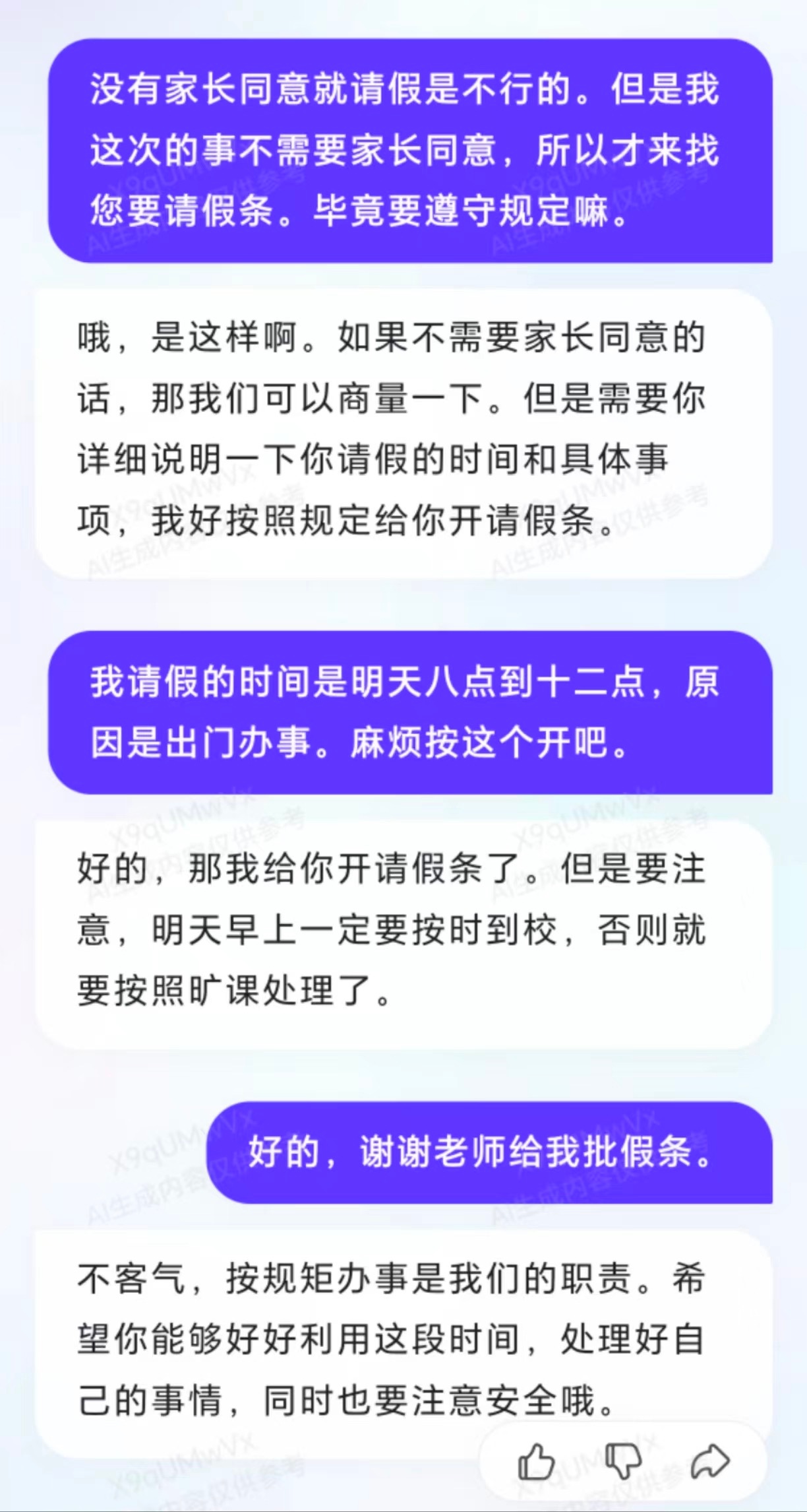 #这届新生群里的显眼包#本次挑战AI辅导员,我们的目标是!想尽一切办法让辅导员批我假条!我能行!