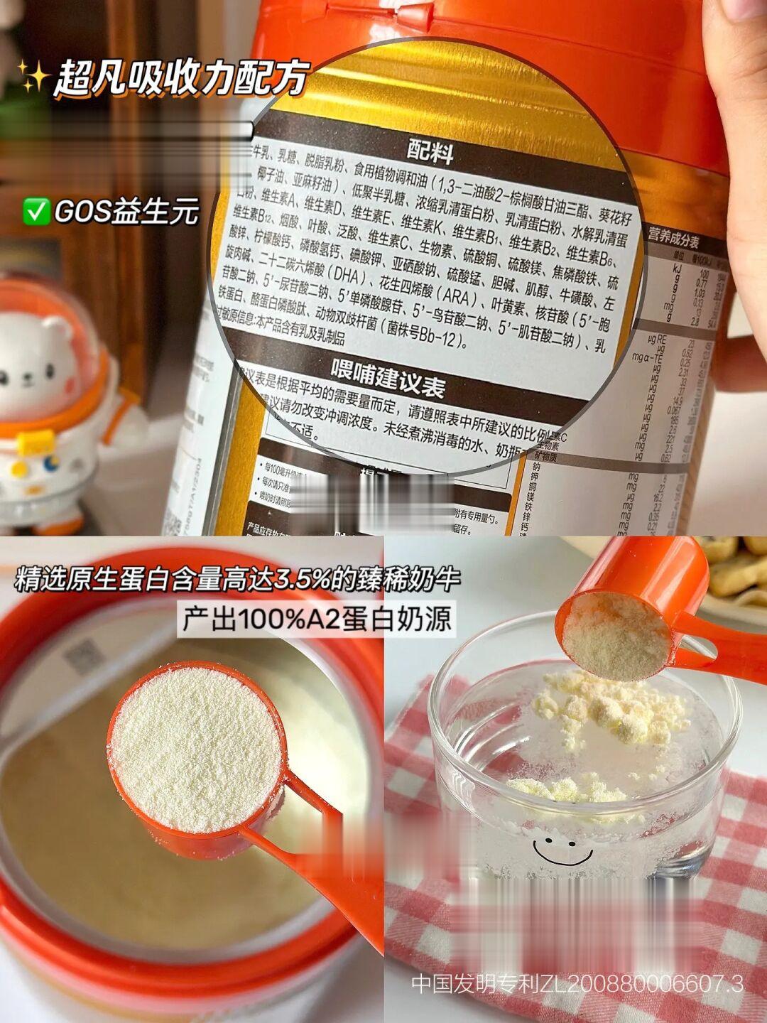 吸收配方上还有新一代专利OPO,促进脂肪和钙的吸收,以及小分子蛋白水解乳清蛋白和GOS益生元,可以帮助宝宝更充分的吸收营养~