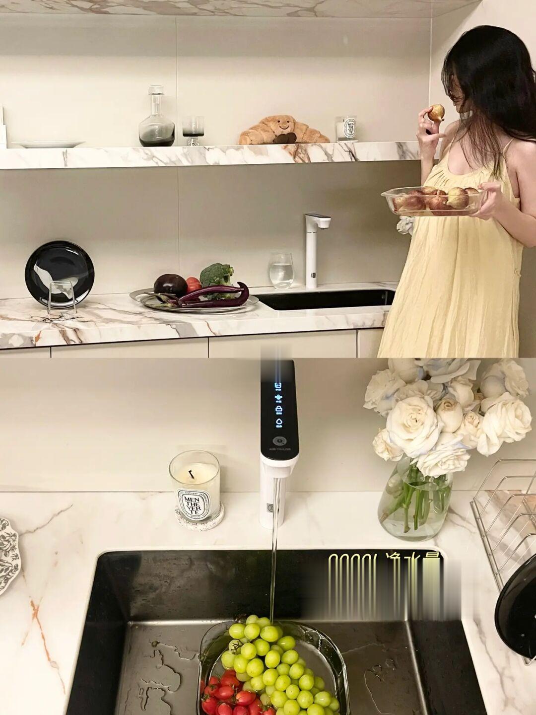 哈咯大家好 最近给楼下的餐厨区进行了不少升级改造 虽然楼下的餐厨区不是传统意义上的厨房 但平时使用频率还是很高 比如看电影的时候经常需要清洗水果、喝咖啡、泡面之类的 之前要在楼上备好再拿下楼真的太麻烦了~终于忍不住在楼下餐厨区安排上净水器[暗中观察R] . 有了这台沁园净热一体厨下净水器 生活效率都提高了很多 我平时喜欢在楼下看书看电影 现在可以直接用85度速速给自己安排上一杯奶香咖啡 有朋友来家里喝茶 泡茶也直接选用85度 免去了等烧水的时间,可以跟朋友一起享受喝茶的悠闲,超级方便!~ 有时候肚子饿了 用98度泡个泡面解解馋 体验5秒吃上的快乐! . 沁园和其他净水器的不同在于 可自定义选出水温度范围, 本身预设了常温/45度/85度及98度,4档常用温度 还有童锁按键 出水不容易被烫伤 对有小宝宝的家庭更安全友好~ 另外龙头还配置了智能数显水龙头 ~ 智能又贴心 在屏幕上直接显示水质、水量、温度等指标 可以根据需要即刻调整温度 非常方便~ . 这种直出热水的净水器,我最关心的就是加热方式 因为其实很多这种热水器都是有热罐的,水会被反复加热 现在选的净热一体厨下净水器就没有热罐~ 用水的时候才加热 这样就不会有千滚水,还能避免水的二次污染 用热水的时候想要几度都可以自己在手机自定义 全家都能随时用上温度合适且安心的热水[赞R] . 另外,这台净水器不止能滤除很多自来水里可能会存在的余氯、细菌和病毒这些常见的有害物质 塑化剂、抗生素这种新兴污染物也能帮我们拦截住~ 净化过的水喝起来没有异味 口感顺滑 对于我这种喜欢喝茶的人来说 泡出来的茶都更好喝了[萌萌哒R] . 楼下餐厨区有了这款沁园曜日净热一体净水器 避免了很多麻烦 加上它有1200G大通量,出水很迅速~平时经常跟朋友一起在家聚餐,洗水果这些也不用等啦,一下就能洗好了,朋友闺蜜多在家直接接水喝也很方便~~ 想要直接喝热水或做饮品 也不用再上楼或者另外烧开水啦 设备安装在厨下不影响厨房外观,而且很小巧不占地方 家里的电器不断进化 我的三层小家 住起来也更舒服了! .