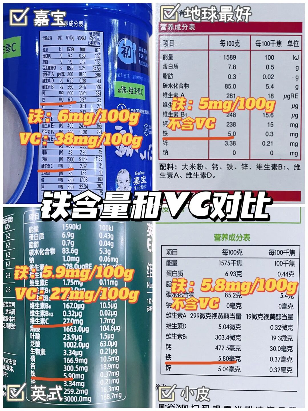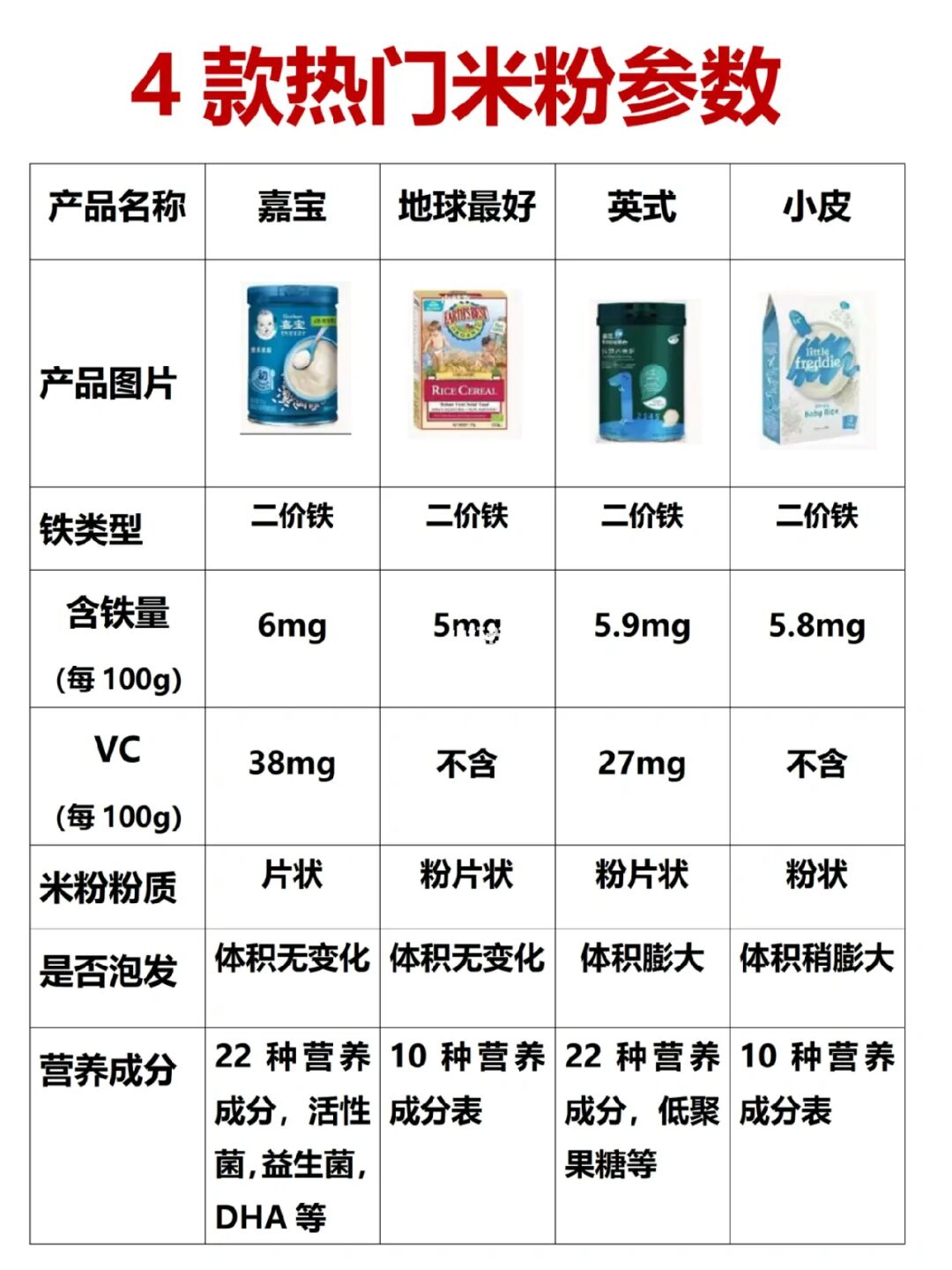 如果你也在纠结米粉推荐婴儿宝宝吃哪款,可以试试嘉宝高铁米粉[种草R]也是我家宝宝超爱的一款~,它采用CHE谷物水解工艺,将淀粉大分子变小分子,片状的粉质很好冲泡,而且不易泡发[气球R]吃进肚肚里米粉不会越胀越大!!宝宝吃完肚肚更舒适。它还有活性益生菌,DHA等,营养也非常全面~铁含量和VC含量也是这几个牌子里最高的,很适合给宝宝补充铁元素[飞吻R]