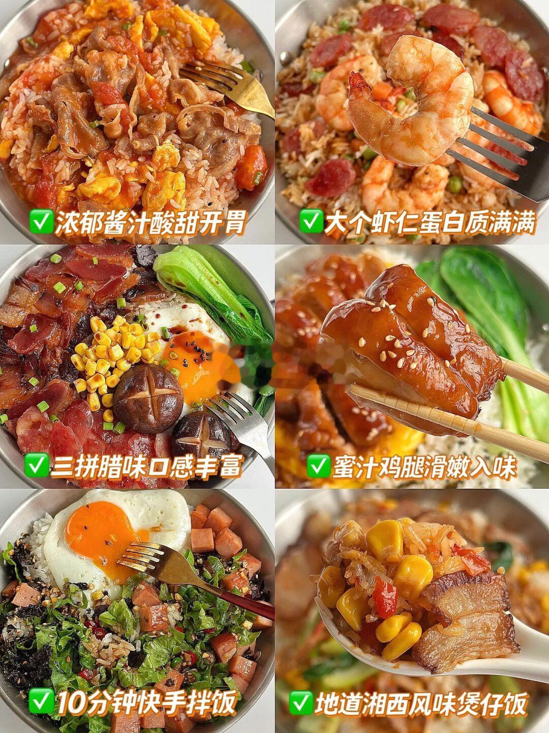🙋碳水脑袋集合!中国胃真的离不开米饭🍚 🥰感谢饭乎邀请试吃,真诚分享~ ✨分享6⃣️种宝藏米饭吃法,有拌饭、盖饭、煲仔饭,基本上15分钟就能搞定!👏🏻味美料足、快手好做、下饭一绝,大人孩子都爱吃,一周不重样[派对R]告别外卖,假期也要好好吃饭哦! · ——✨6种超好吃米饭吃法合集✨—— · 🍅番茄肥牛滑蛋饭 🍗蜜汁鸡腿盖饭 🦐鲜虾腊肠煲仔饭 🍄广式腊味煲仔饭 🐷生菜午餐肉拌饭 🍱烟笋熏肉煲仔饭 · 🌈食材及制作方法都在图片上啦,有不明白的姐妹欢迎举手提问 · 以前做煲仔饭买菜备料要弄很久,自从入了饭乎速烹煲仔饭,15分钟就能炫嘴里!里面有丝苗米、腊肉、酱油、油,还送了砂锅,太贴心了哈哈!👏🏻它家是用的当季新米,新米煲出来的米饭粒粒分明有嚼劲,锅底还有焦香锅巴!广式腊肉还有点酒香,拌上酱汁,再加点虾仁、鸡蛋、香菇、小油菜,一口下去真的太满足了[萌萌哒R]连女鹅都好爱吃~ · 米饭的6种神仙吃法,快安排上吧!下期见~