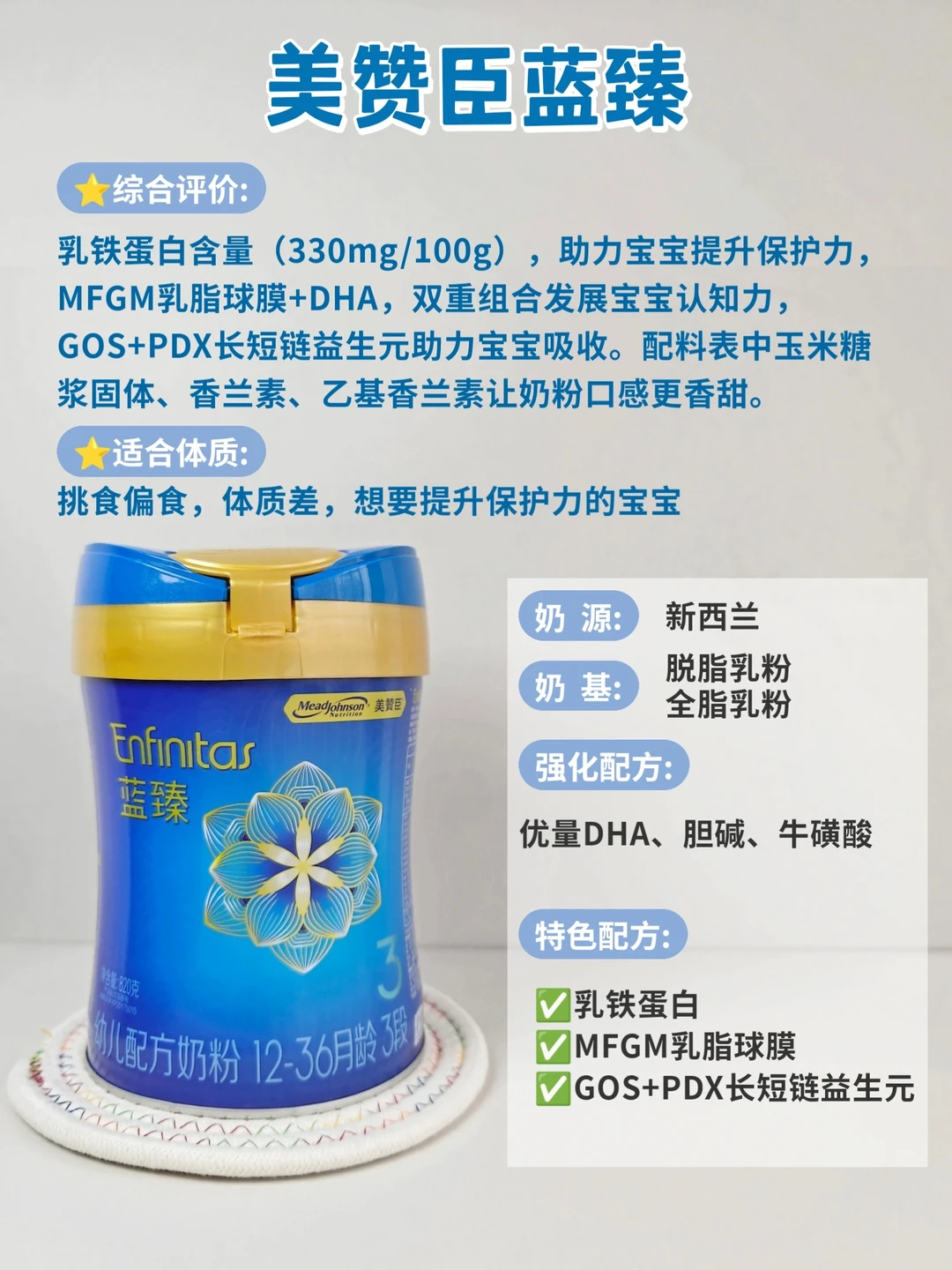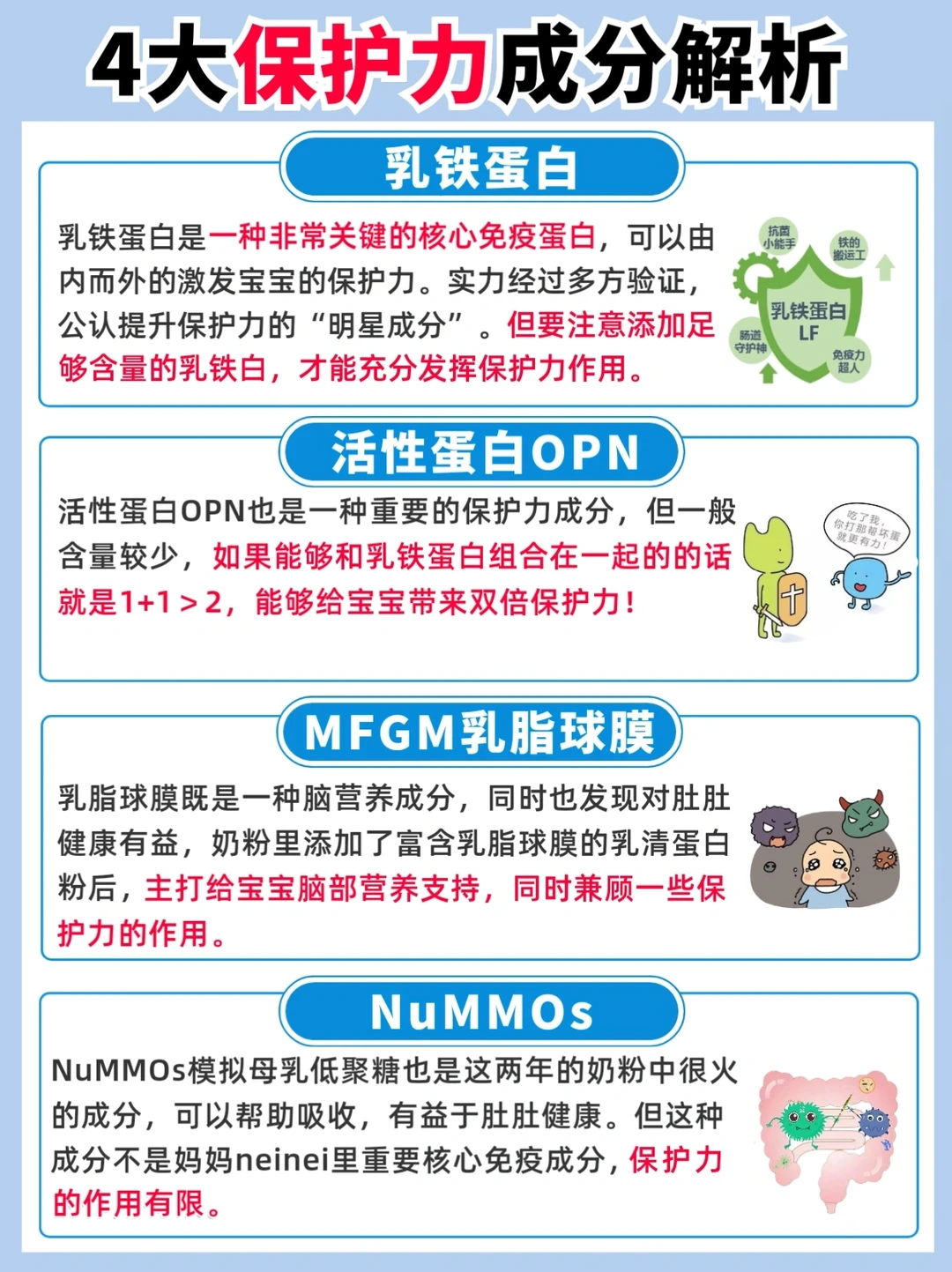 💫保护力方面:乳铁蛋白+OPN组合保护力更佳,且高含量乳铁蛋白才能真正发挥保护作用;且如果有其他的保护力成分来辅助更能为产品增色不少,比如保护因子群。