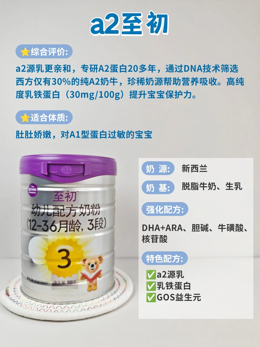 新西兰黄金奶源地,含有珍稀的A2蛋白,乳铁蛋白和益生元GOS,更亲和好吸收,适合对A1蛋白过敏,肚肚娇嫩的宝宝