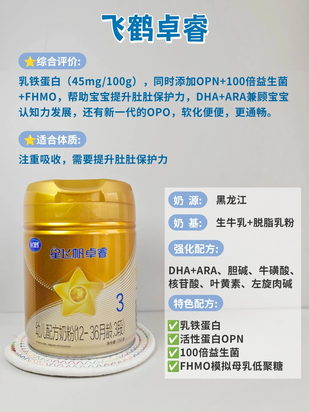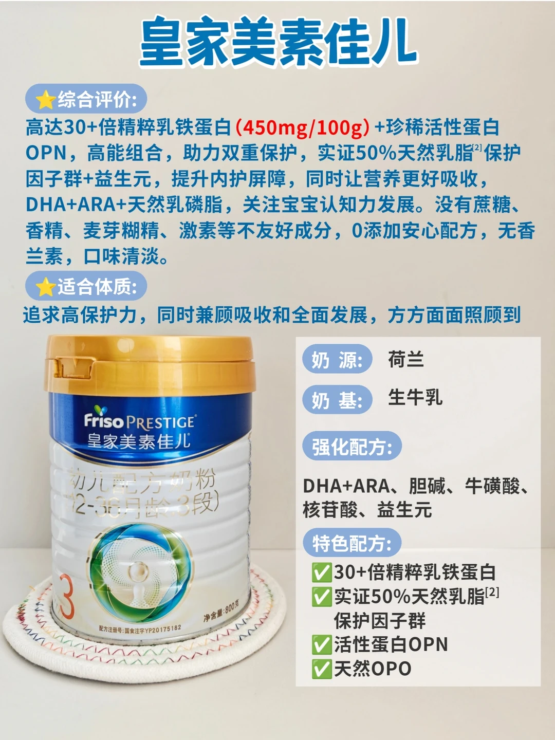 30倍乳铁蛋白,含量450mg/100g,乳铁蛋白+OPN组合,助力双重保护;还有实证的50%天然乳脂保护因子群,保护力直接拉满,同时更能促进DHA、ARA的吸收,天然OPO让肚肚更舒适。适合体质弱、爱生病,需要提升高保护力,同时兼顾吸收、认知力等方方面面都要照顾到的,致力更全呵护!0添加的安心配方,给宝宝喝很放心❤️。