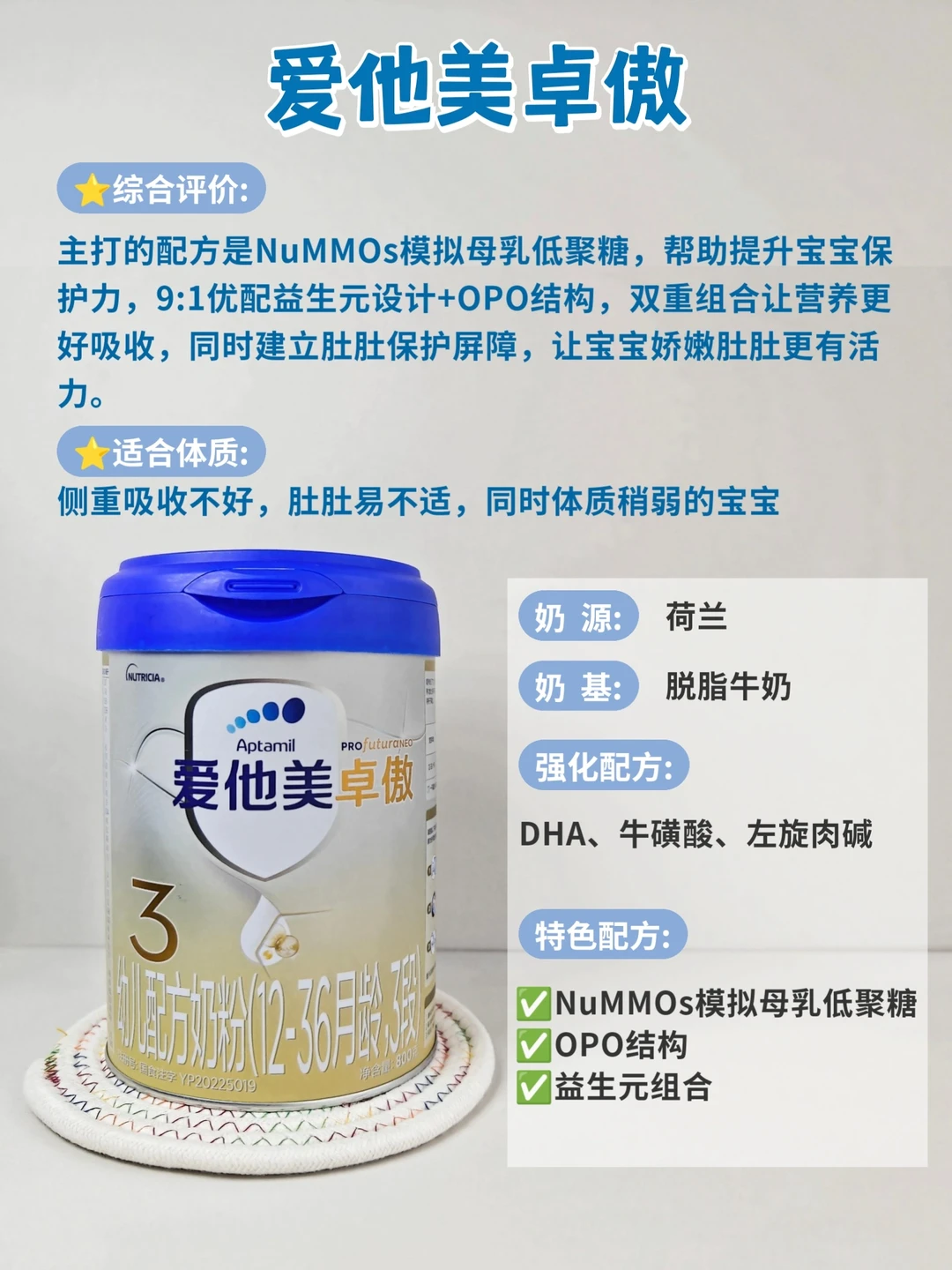 主打NuMMOs模拟低聚糖,全乳糖配方,无水奶油,优配益生元+OPO结构,减少肚肚不适,适合便便不畅,吸收不好的宝宝