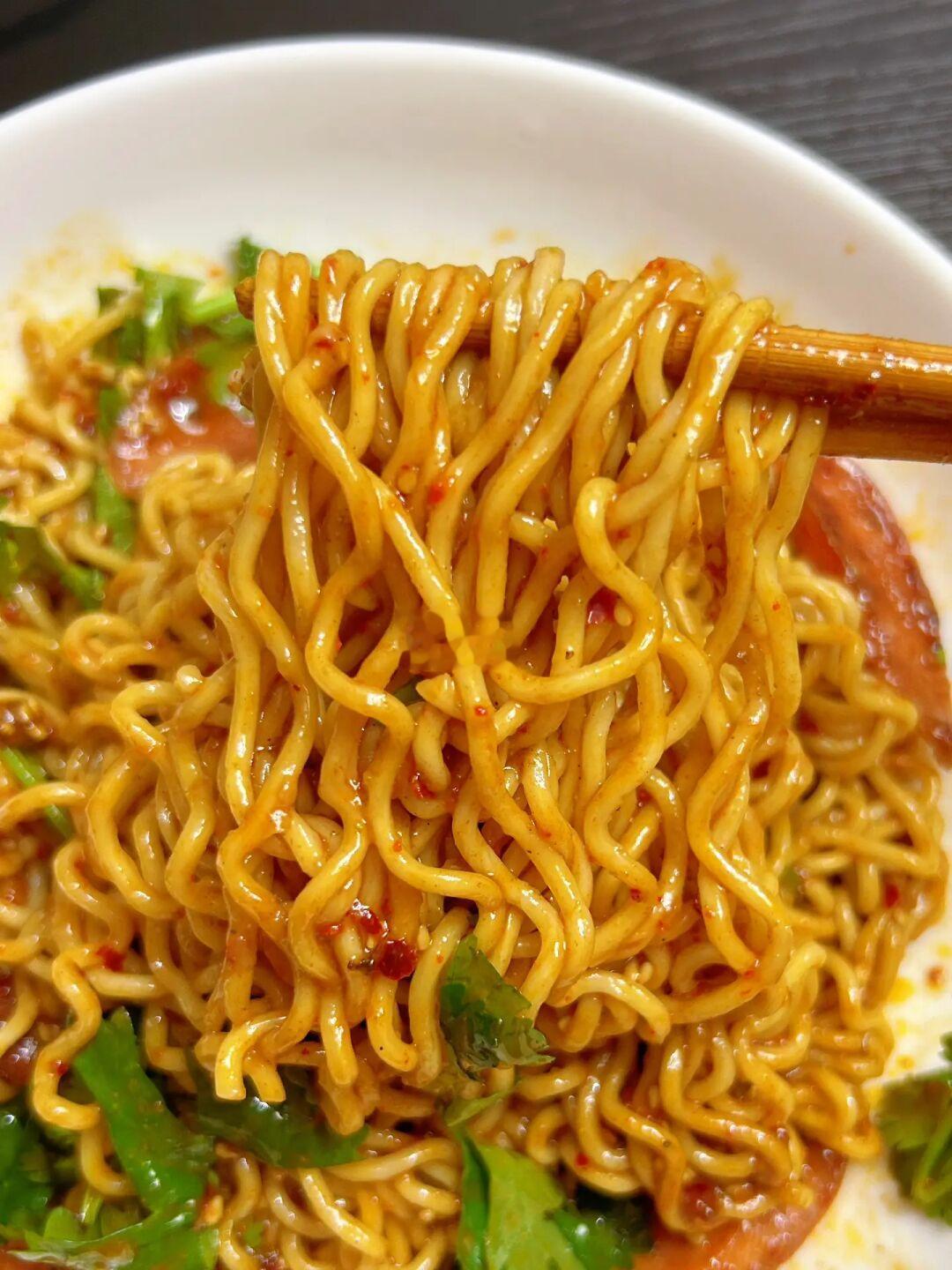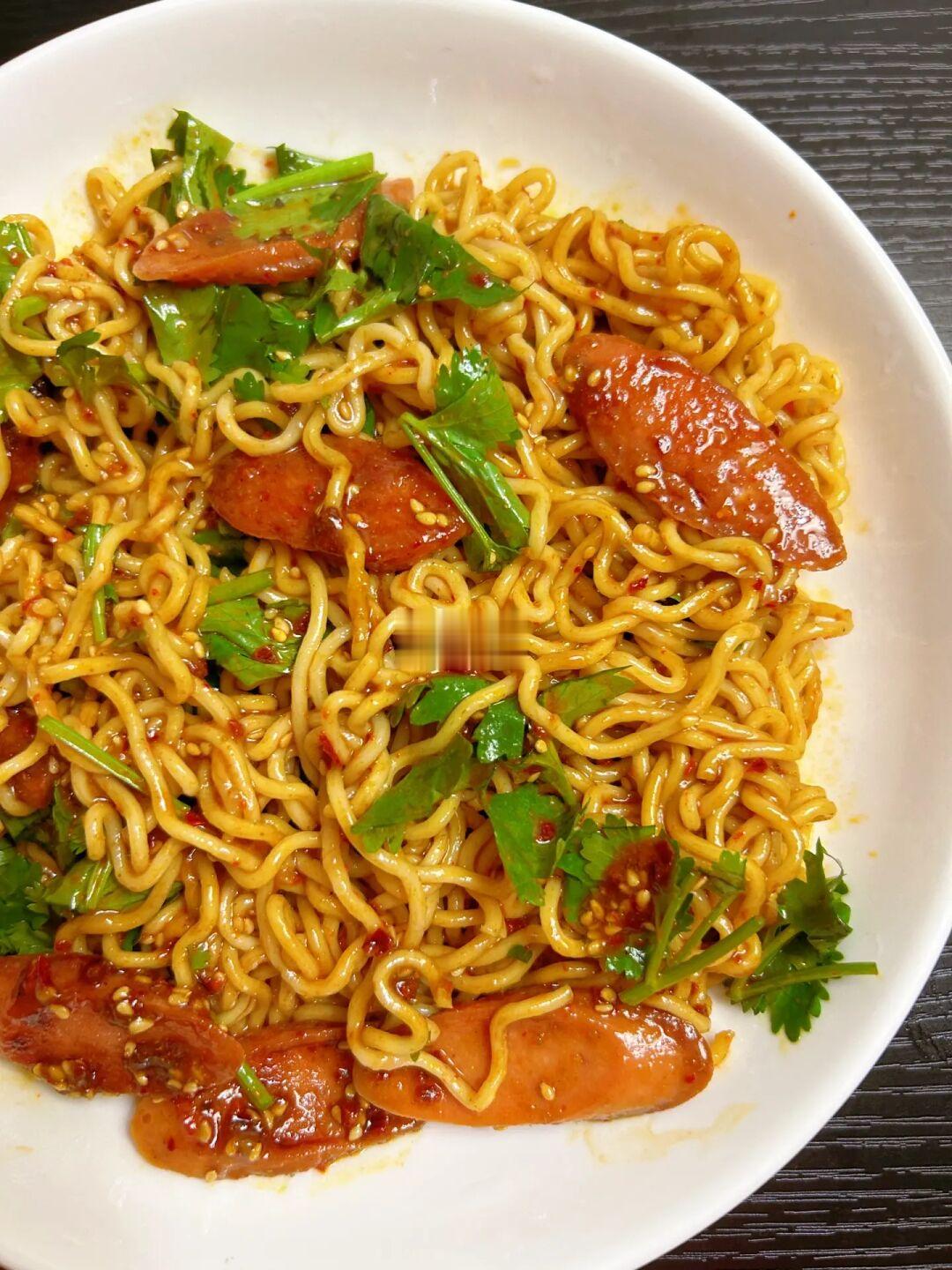 这个火腿孜然拌面真的绝!! 方便面的天花板吃法!!! 太香啦!! 1⃣️调个料汁:孜然粉、辣椒粉、白芝麻、番茄酱、蚝油,浇上热油,再加入1勺生抽、1勺香醋拌匀 2⃣️煮方便面,火腿肠煎一下,一起装盘,加上香菜和料汁拌匀 完成✅ 太好吃啦!! 特别适合懒人姐妹!!