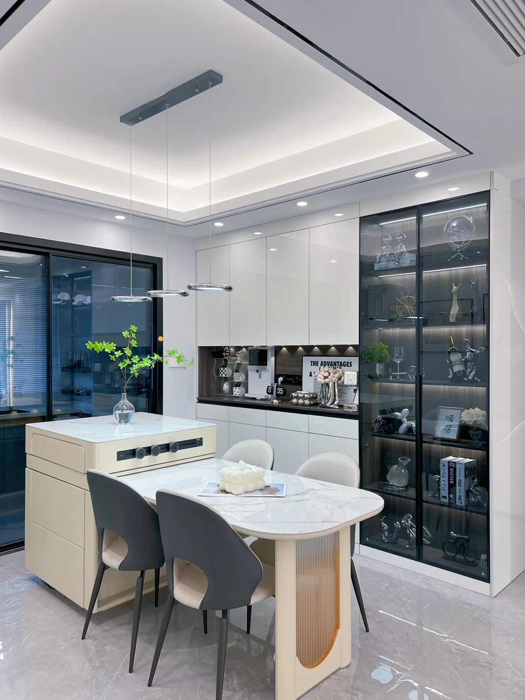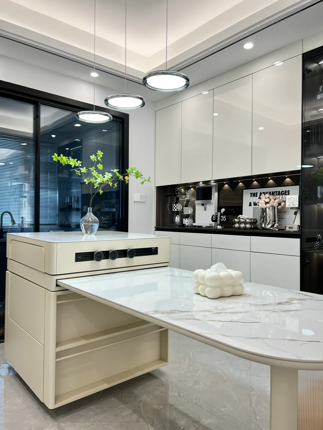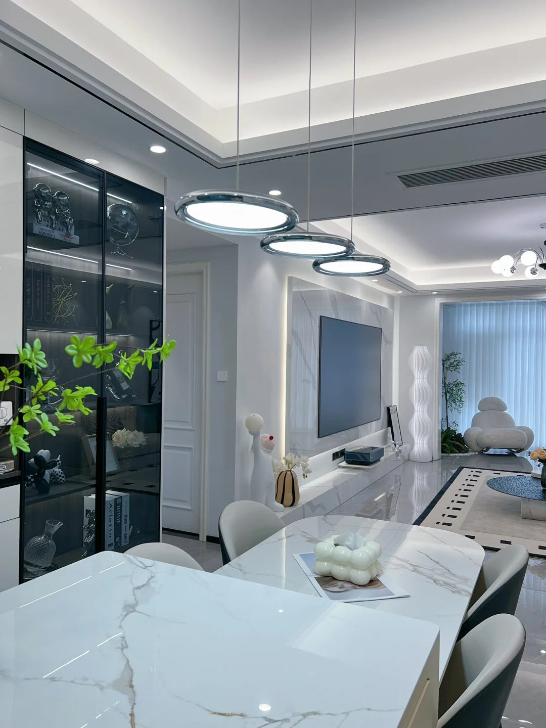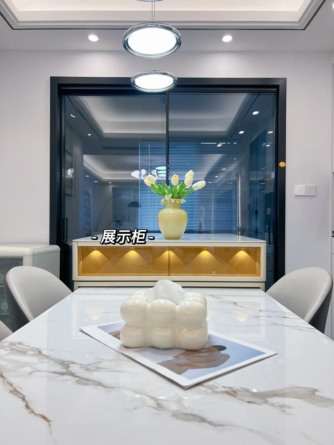 •餐桌:餐厅不小,但也说不上大,为了让空间得到最大程度的利用,选择合适的餐桌是非常有必要的,我选的是林氏家居的魔方岛台餐桌。明亮高级的岩板花色能够让空间看起来更加大气,不仅颜 值高,而且很实用!