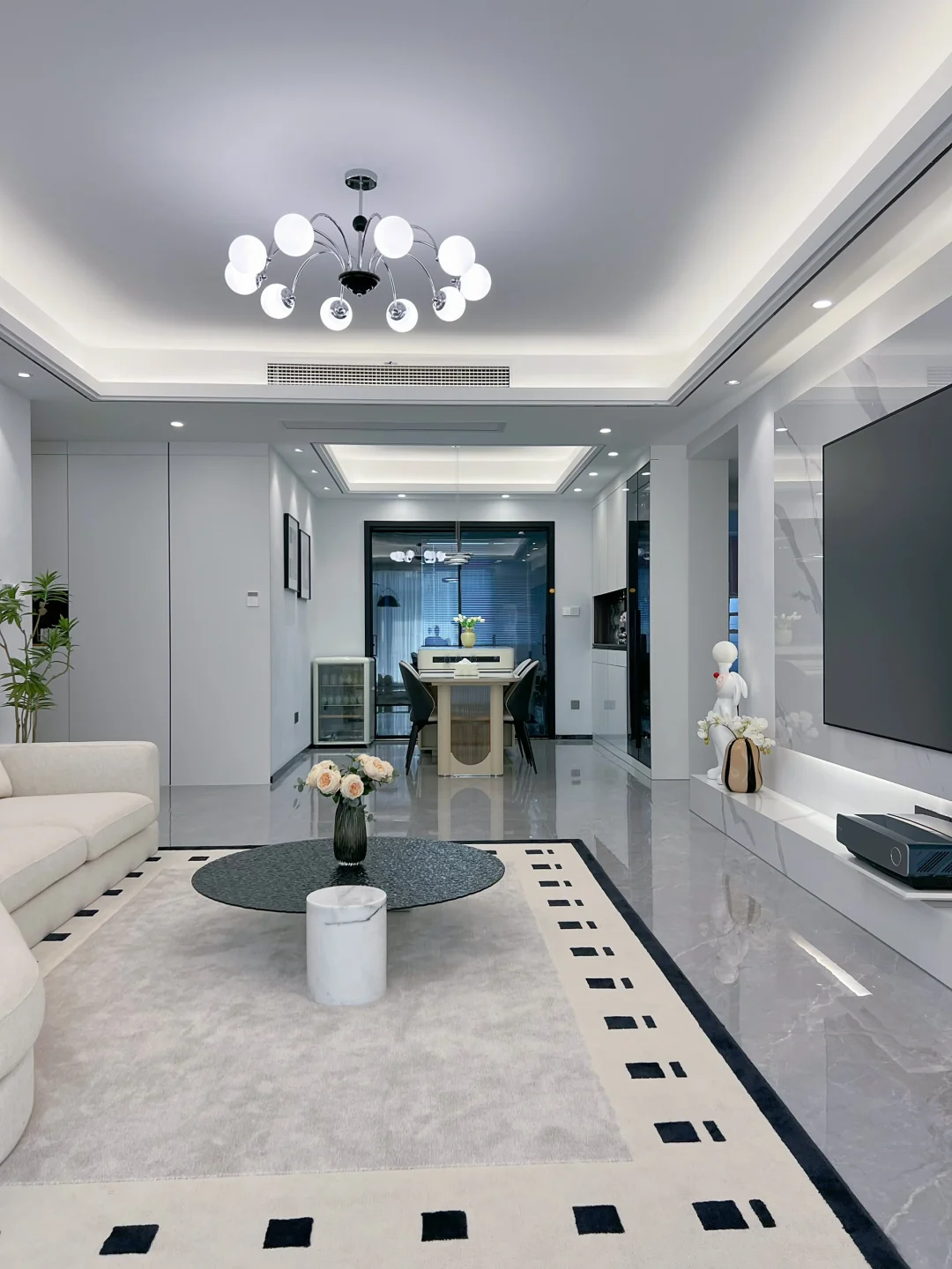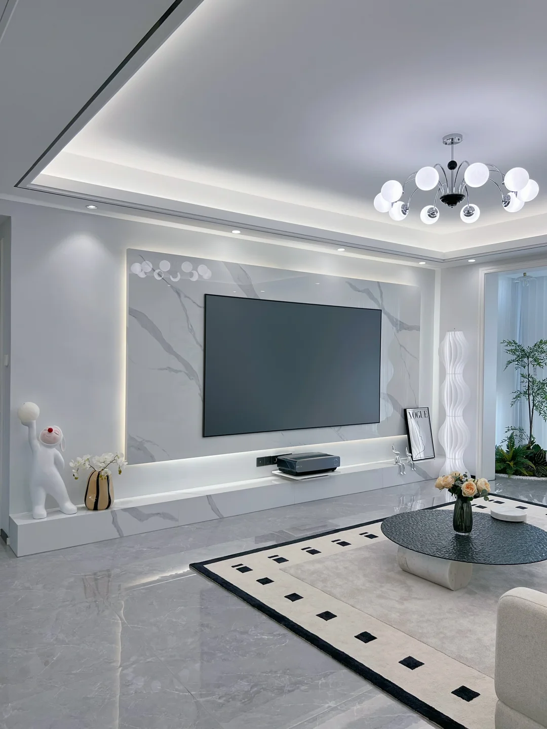 • 电视背景墙:悬空岩板背景墙,搭配乳胶漆打底,简约有质感~