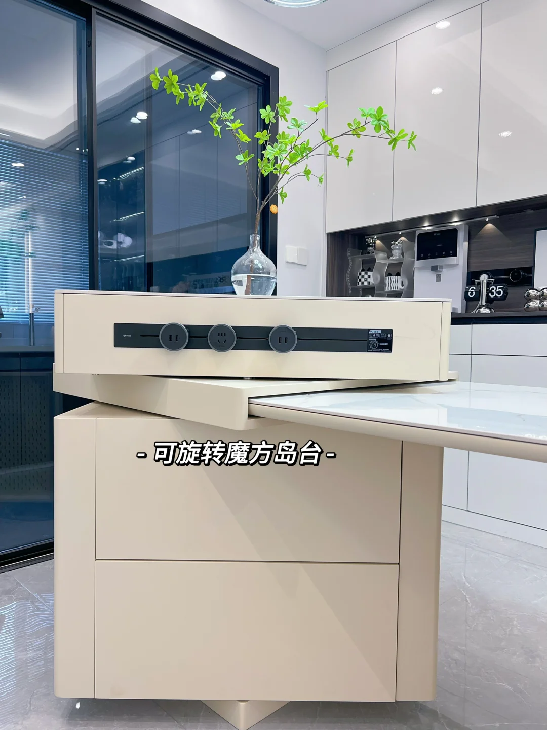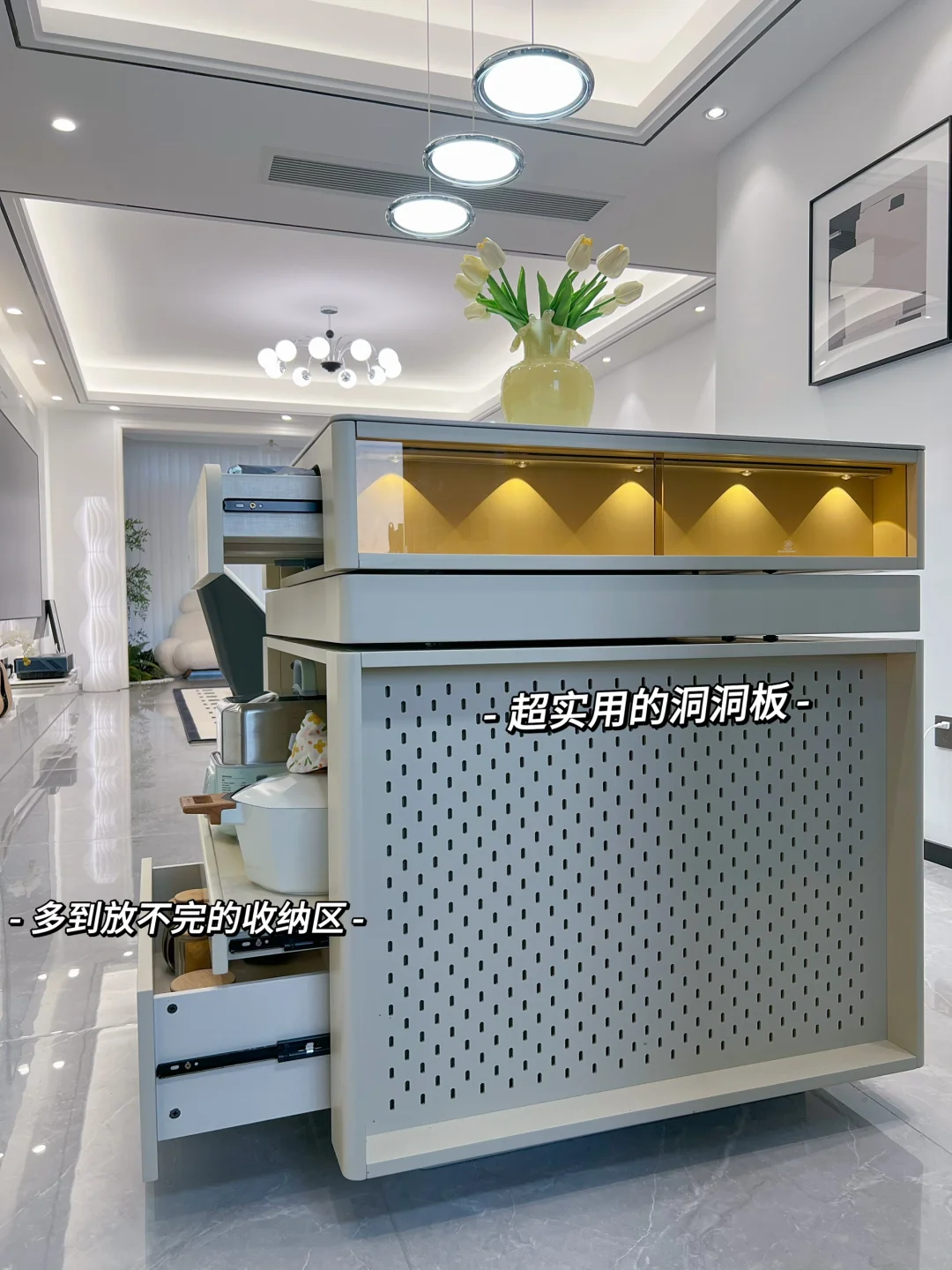 双边都拥有大空间的储物抽屉和柜子,完全满足日常收纳需求,还配有洞洞板,很好地增加了空间的利用率,而且岛台上下还是360°可旋转的设计,就像魔方一样,旁侧还有棕色的玻璃展示柜,可以展示自己心爱的小物件,这个我真的太心水了