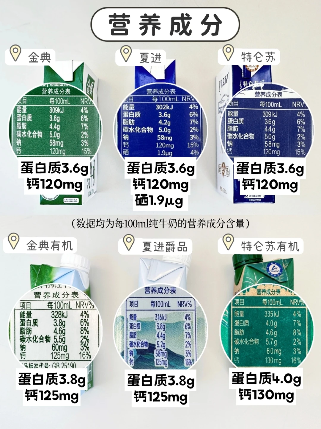✅ 选择蛋白质含量3.0g以上、钙100mg以上牛奶,蛋白质和钙的含量越高越好