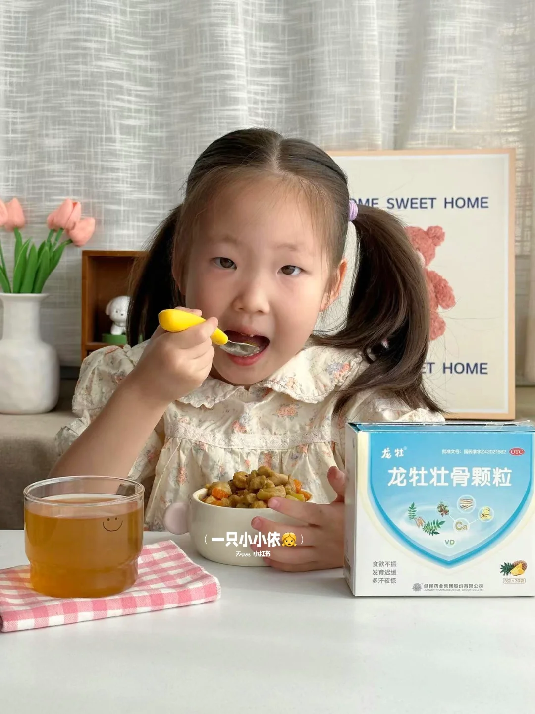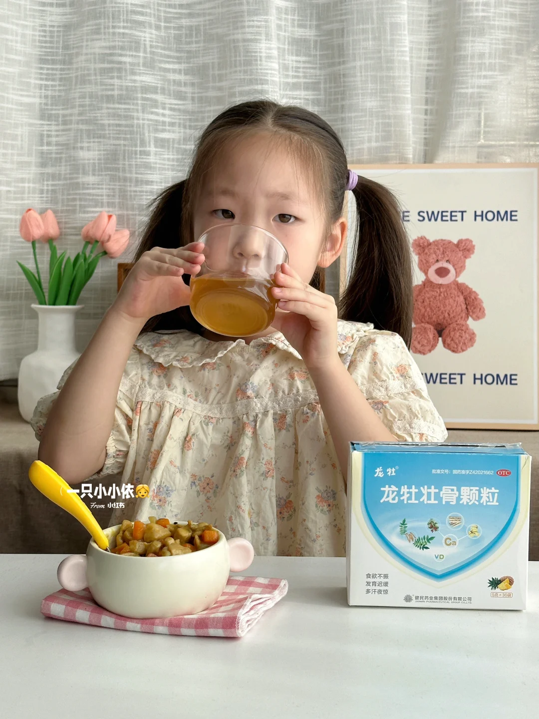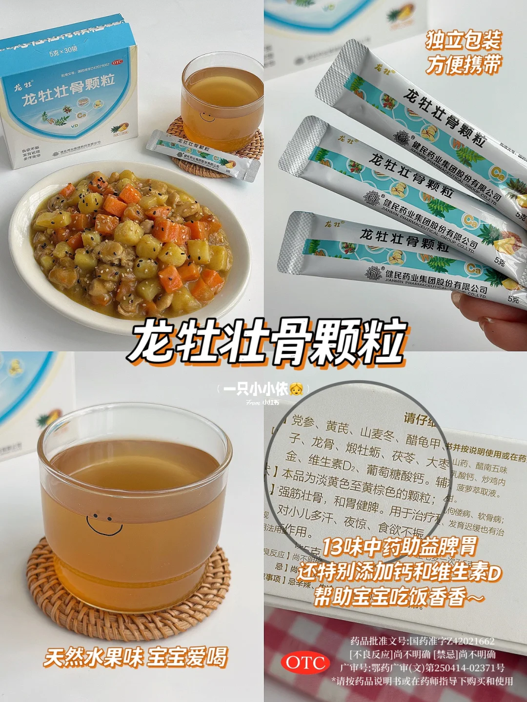 🍲宝宝挑食不爱吃饭,除了多尝试不同类型的食物促进胃口,我也会给孩子来一杯龙牡壮骨颗粒哦[哇R]它里面含党参、茯苓、鸡内金等十三味助益脾胃的天然中药成分,鸡内金可以帮助调理宝宝的脾胃,促进消化😊而且它还特别添加了有机钙和维生素D,不仅吸收率高,也很温和,不用再额外补充维D了,很省心!😆酸酸甜甜的水果味,冲出来女鹅很爱喝~