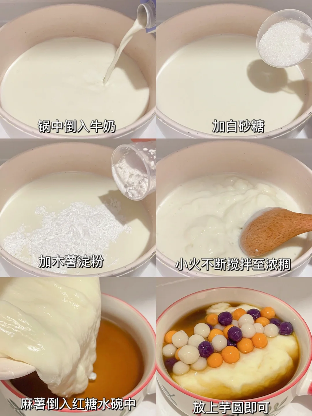 3⃣️锅中倒入牛奶,加白砂糖和木木薯淀粉,小火不断搅拌至浓稠状。