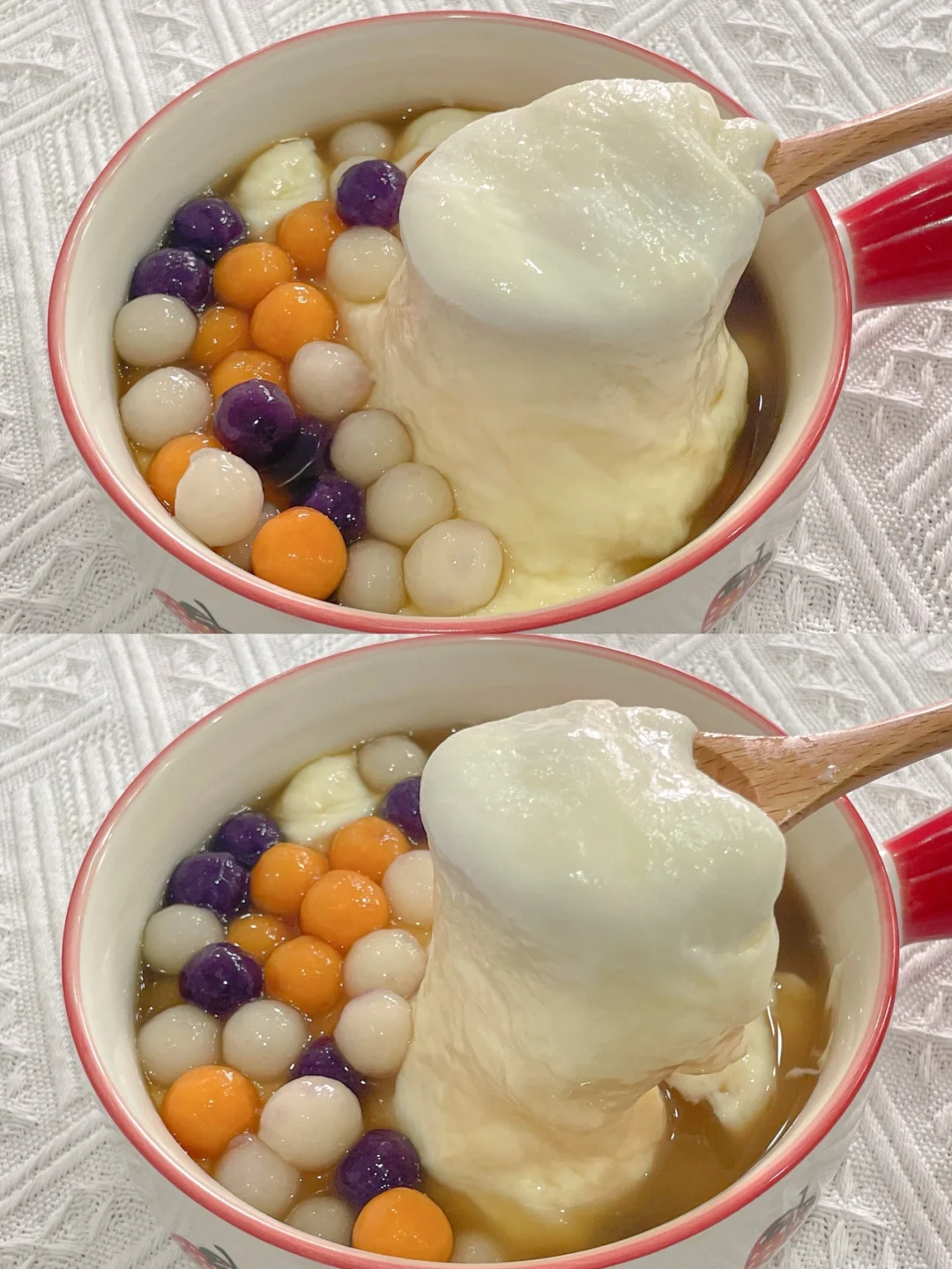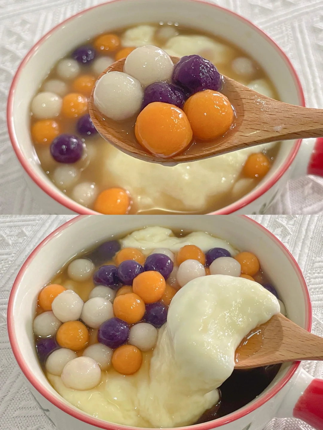 4⃣️将麻薯倒入红糖水碗中,放上芋圆即可开吃。