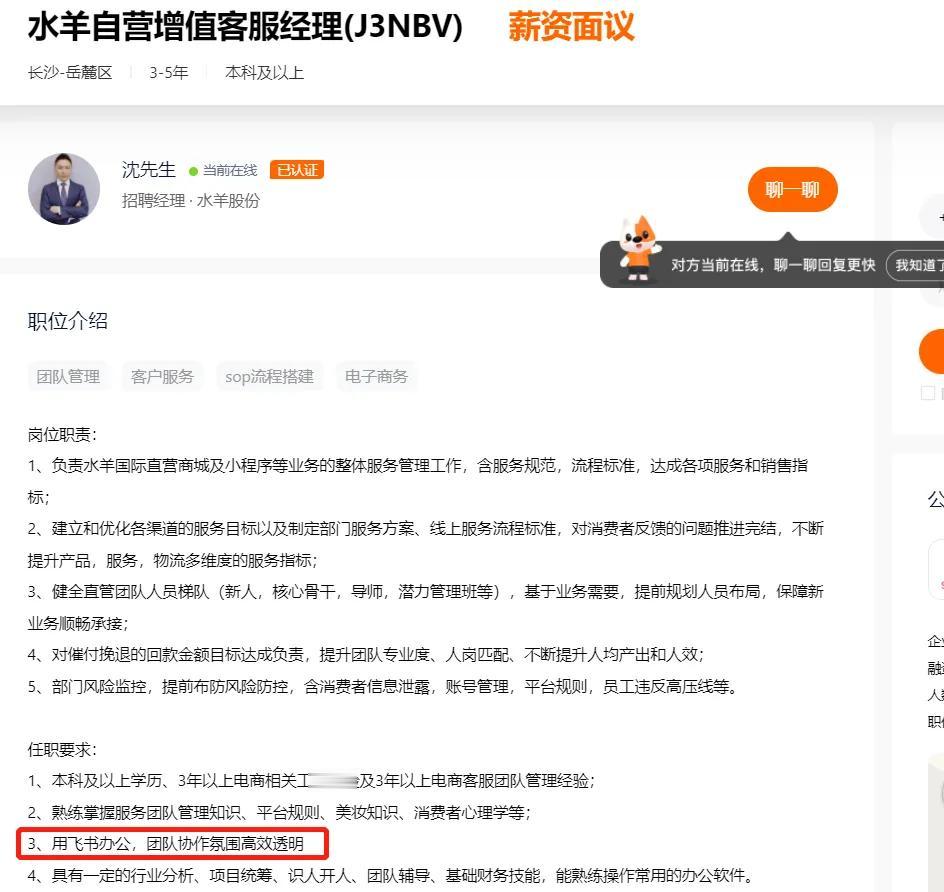 这招,真是太棒了!今天一个春招的职场新人分享了一个信息,说他去招聘大会上去应聘工作,HR提出要会使用飞书。 这个职场新人刚开始还不知道什么是飞书,回头他就去下载使用,发现飞书是一个让企业扁平化管理的软件,什么意思? 比如传统的管理层层汇报,基层人员的真实信息无法反馈给大BOSS,但是飞书却不一样,它是去管理垂直化的软件,你在上面分享的信息在企业是公开透明的,也就是说如果你的上司想欺上瞒下那是不可能的。 除此之外,飞书可以提升工作效率,比如你遇到了一个工作中的困扰,可以在上面快速@其他同事,然后得到反馈解答。 对于职场新人来说,只要你有能力就不怕被埋没了,因为飞书可以让你在职场上的能力得到公平展示。 今年春招脉脉还有元气森林、理想汽车等行业带头,将“办公使用飞书”列入招聘启事,与福利、奖金、假期等其他吸引人才的优渥条件。对于职场新人来说,掌握正确使用飞书的功能,真是非常具有竞争力!#3成求职者开始看重办公软件# #找工作去先进团队# #飞书#