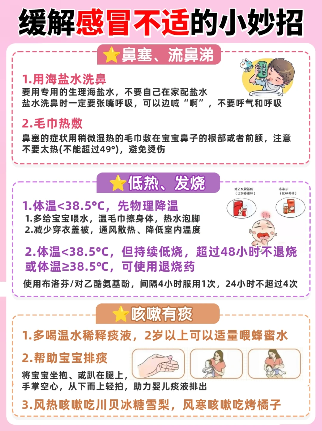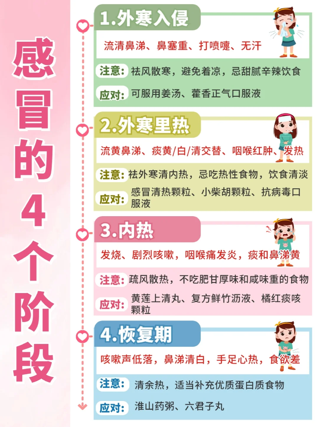 🔷风寒:流清鼻涕、咽痒,舌苔白、嗓子不疼,高发于秋冬季、气温骤降波动时期,发热体温不高,多在38℃左右