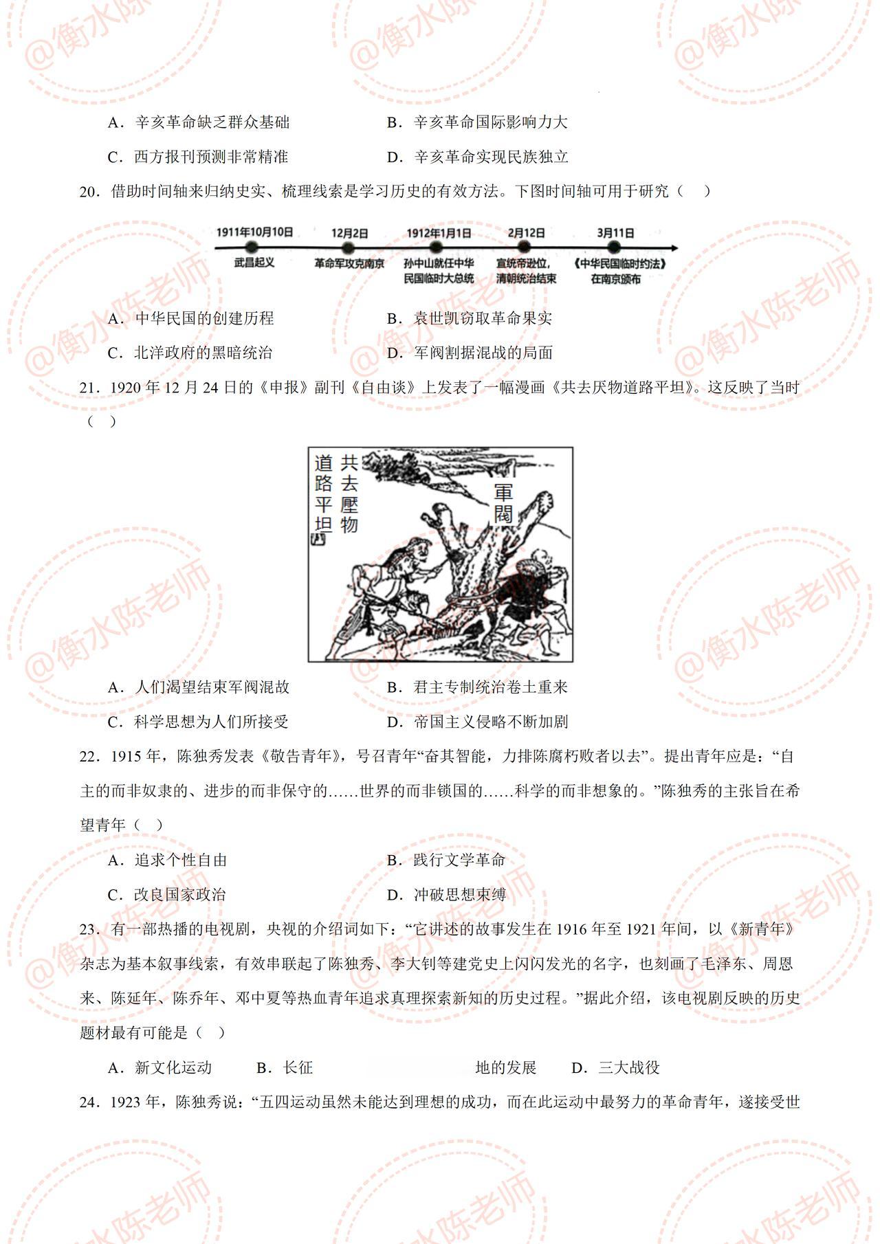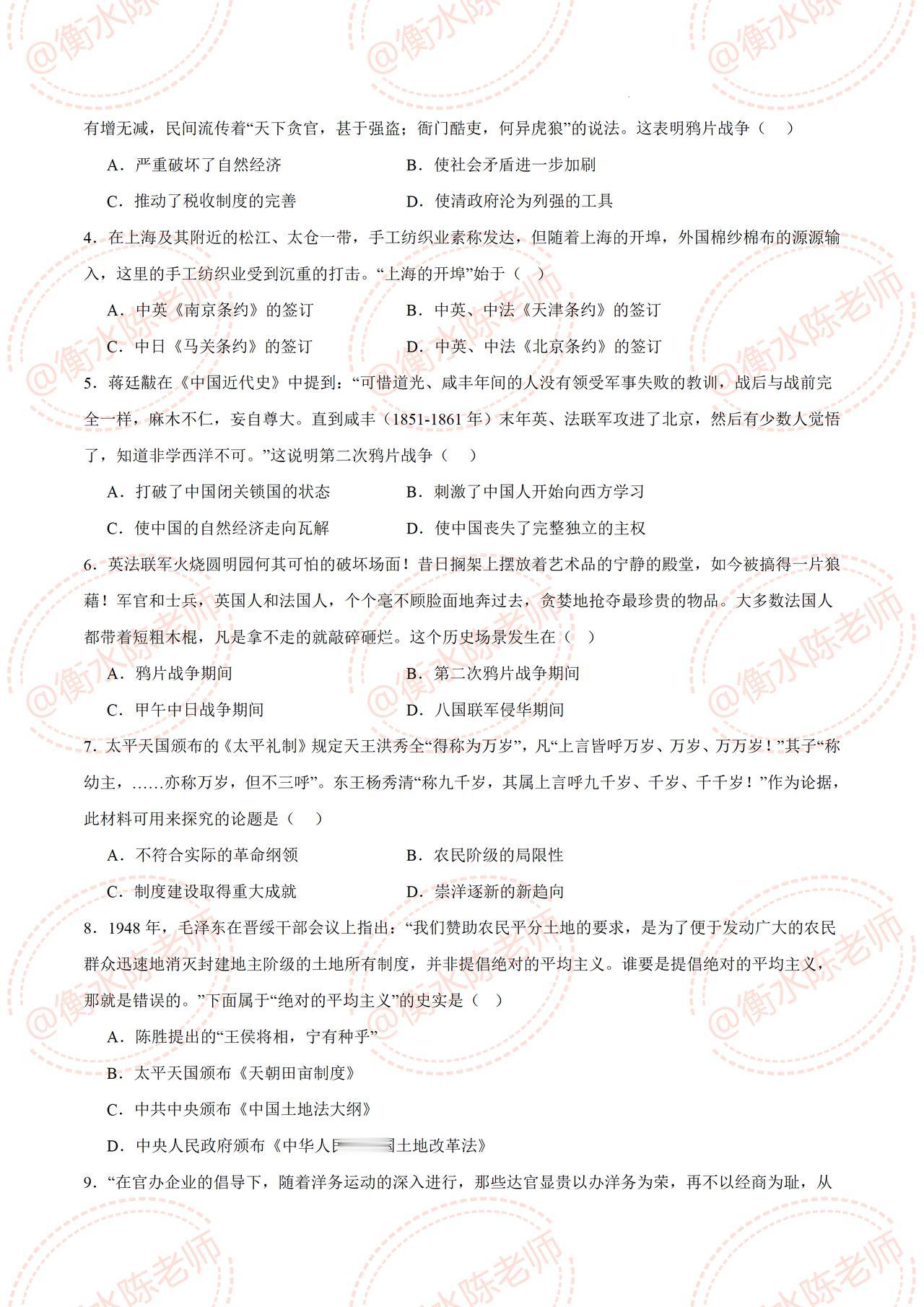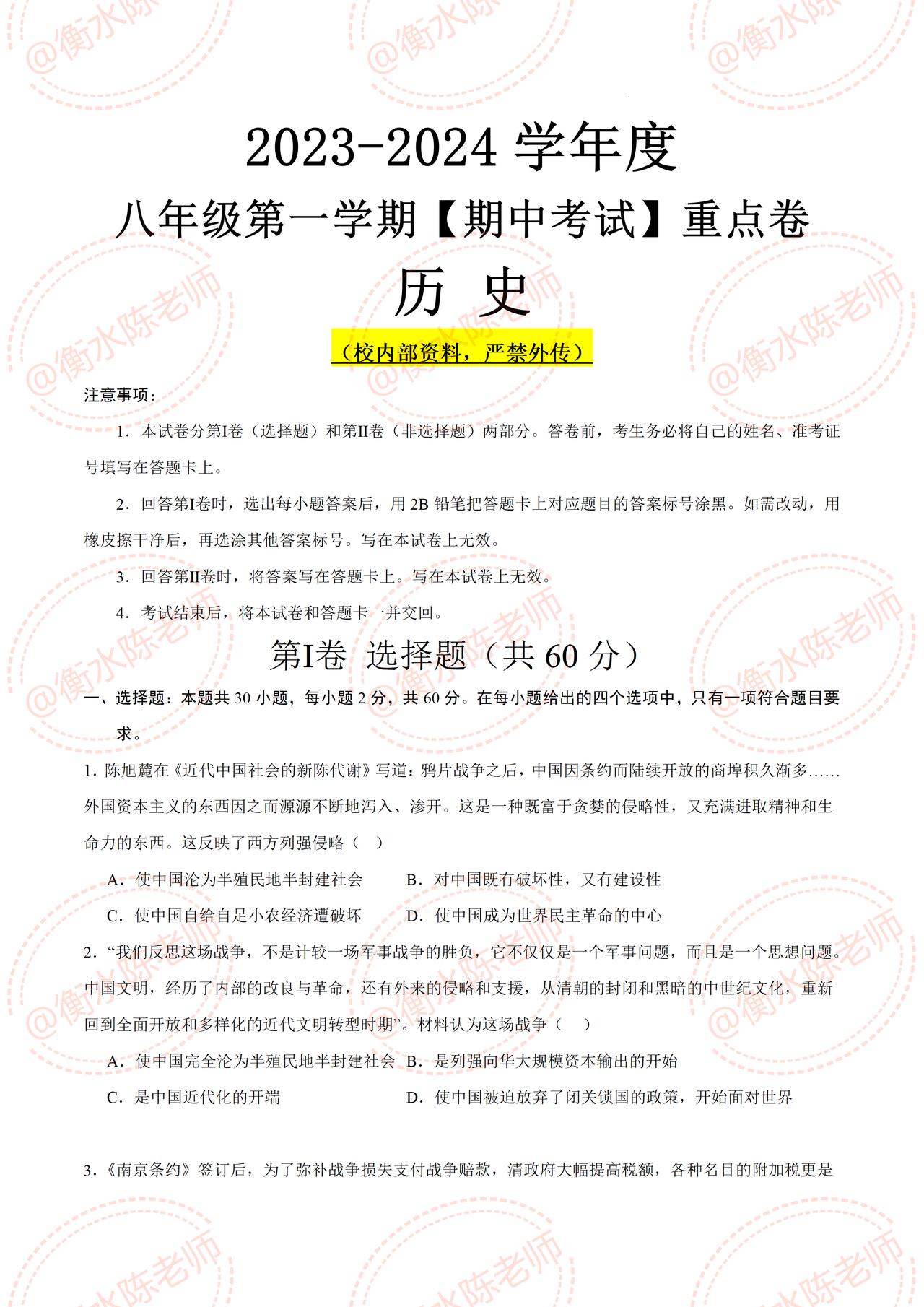 八年级上学期历史,平时考试中经常出现错误,易马虎的热点题型,提前发给大家一部分,历史成绩差的,提前把这套高频常考的考题,认真做完哦,期中考题,是根据不同的城市、版本编写的,想要获取自己城市,对应的期中卷哦,提前和我沟通一下哦,考试让你少走弯路,多考分数哦。