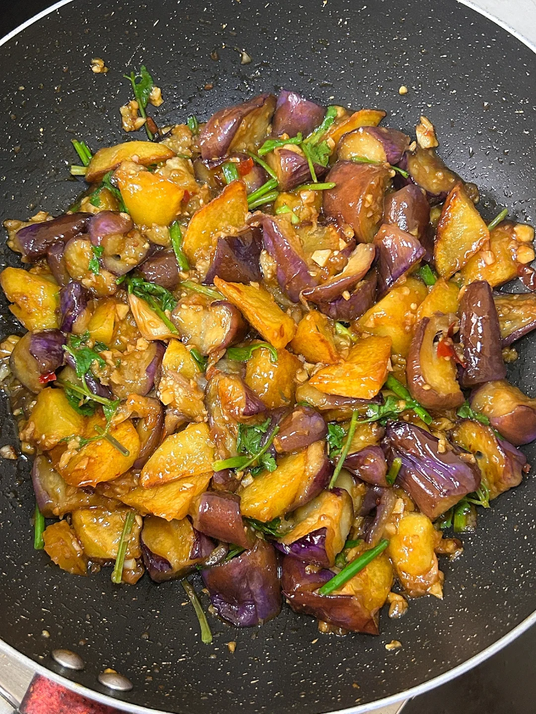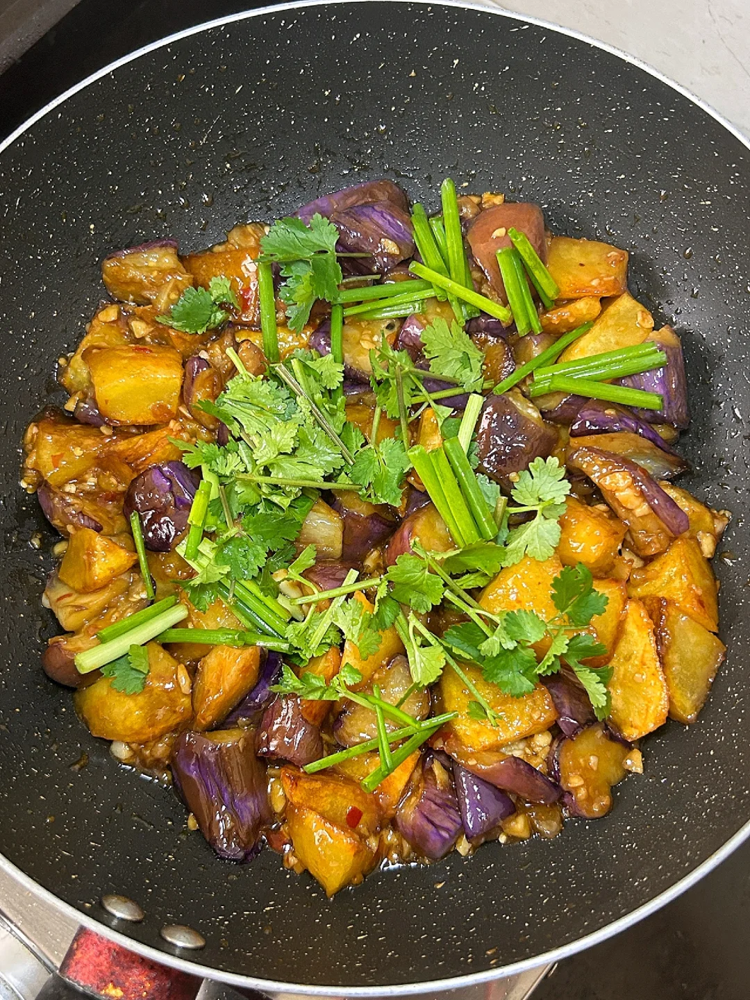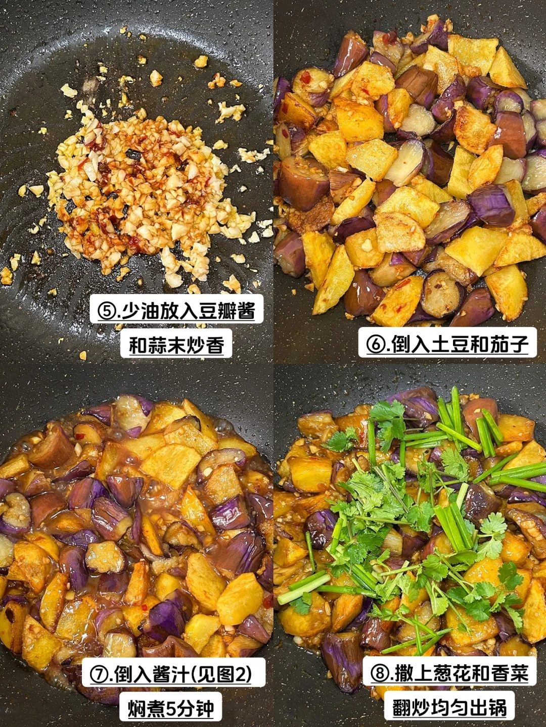 🔸少油放入豆瓣酱和蒜末炒香,倒入煎好的土豆和茄子。倒入酱汁🥣,焖煮5分钟。撒上葱花和香菜,翻炒均匀出锅[色色R][色色R]