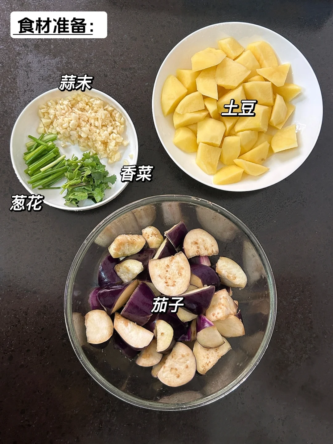 🍆【食材准备】:茄子2条、土豆2个、蒜末、葱花、香菜