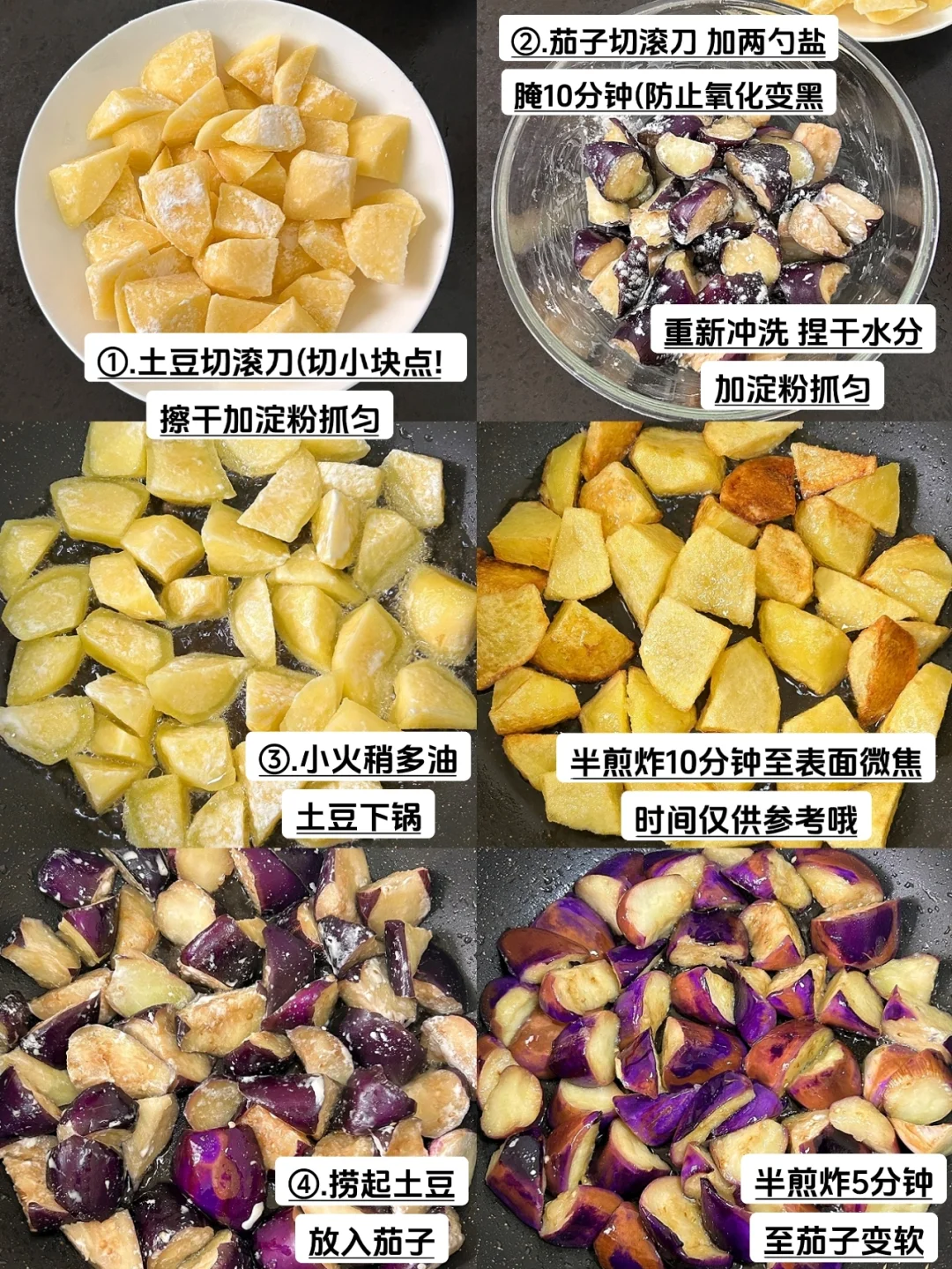 🔸土豆切滚刀,切小块一点更易熟‼️擦干加淀粉抓匀。茄子切滚刀,加两勺盐腌10分钟,重新冲洗后挤干水分,加淀粉抓匀。[斜眼R][斜眼R]关于加盐腌制茄子‼️一是避免氧化变黑,卖相不好看!二是为了腌出水分,下锅后减少茄子吸油量