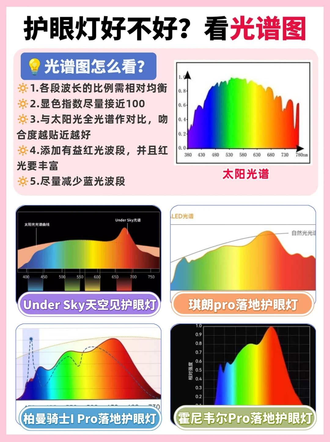 🔹全光谱:各波段比例是否均衡、越接近太阳全光谱图越好,蓝光波段越低越好