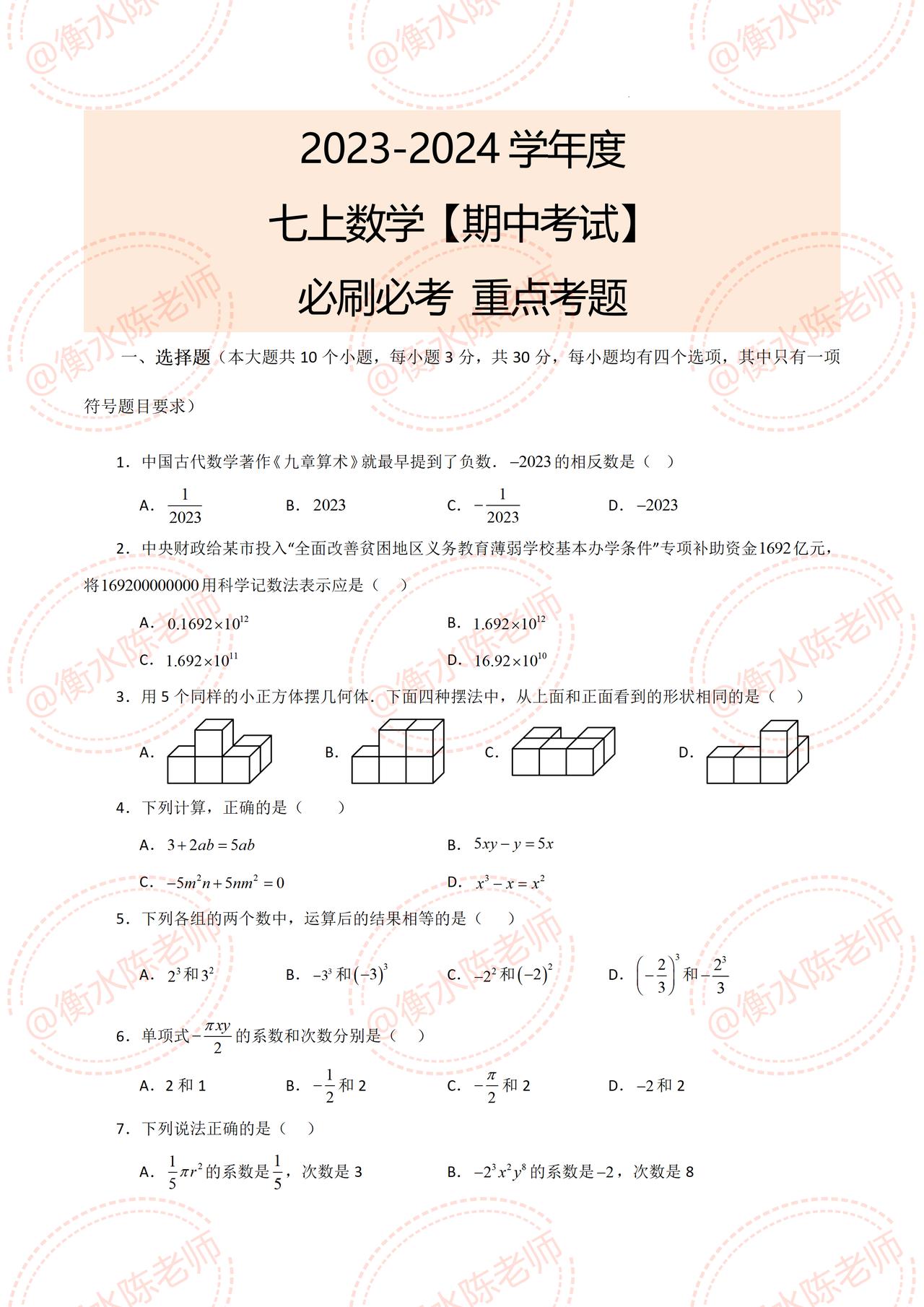 七年级上学期数学期中试卷,根据不同的城市、版本编写的,想要获取自己城市期中试卷的考生,跟我沟通联系哦,考试让你少走弯路,多考分数。