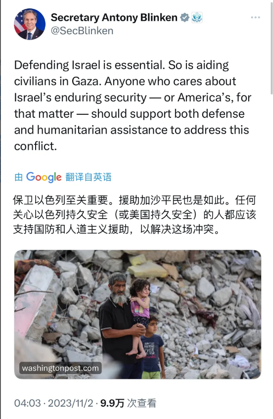 美国国务卿布林肯今天(北京时间11月2日)写道:“保卫以色列至关重要。援助加沙平民也是如此。任何关心以色列持久安全(或美国持久安全)的人都应该支持国防和人道主义援助,以解决这场冲突。”