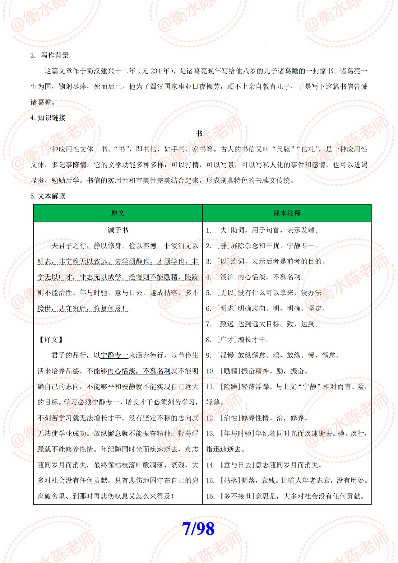 2024年中考语文【文言文阅读】第一轮专题复习,内容涵盖解题大招,提分宝典,易出错、易马虎热点考题,常考重点考题答题技巧,内容从7-9年级,课内课外3年所有内容全部包括,非常全面细致,根据不同的城市、中考大纲编写的,想要获取全部的考生,和我沟通聊一聊,考试让你多考分,少走弯路哦。