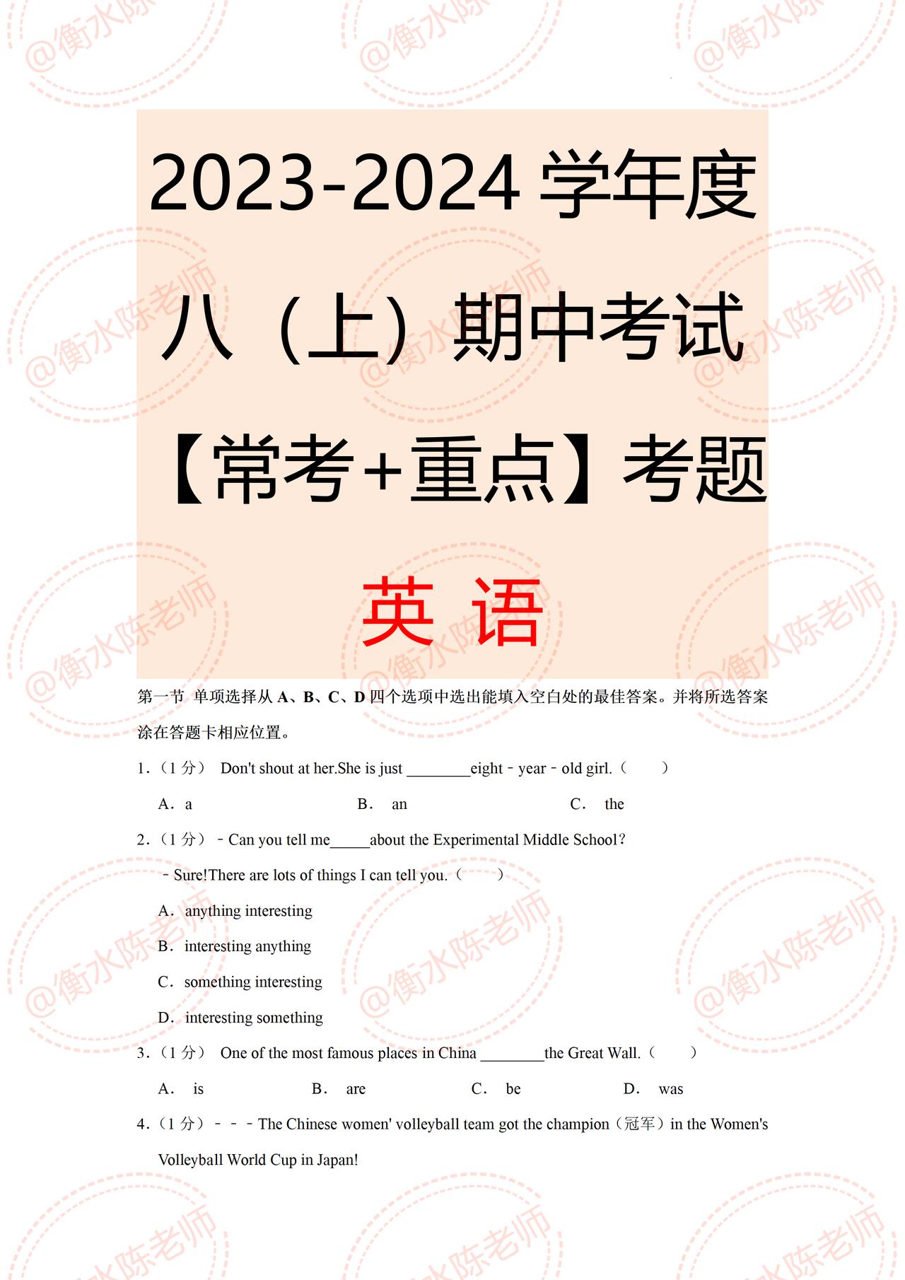 八年级上学期英语期中考试重点考题,是根据不同的城市、学校考试重点编写的,期中考试之前,想要考出好成绩,做一下自己城市对应期中试卷哦,想要获取的,进来和我沟通一下哦,考试让你少走弯路,多考分数哦,考前认真做一遍哦。