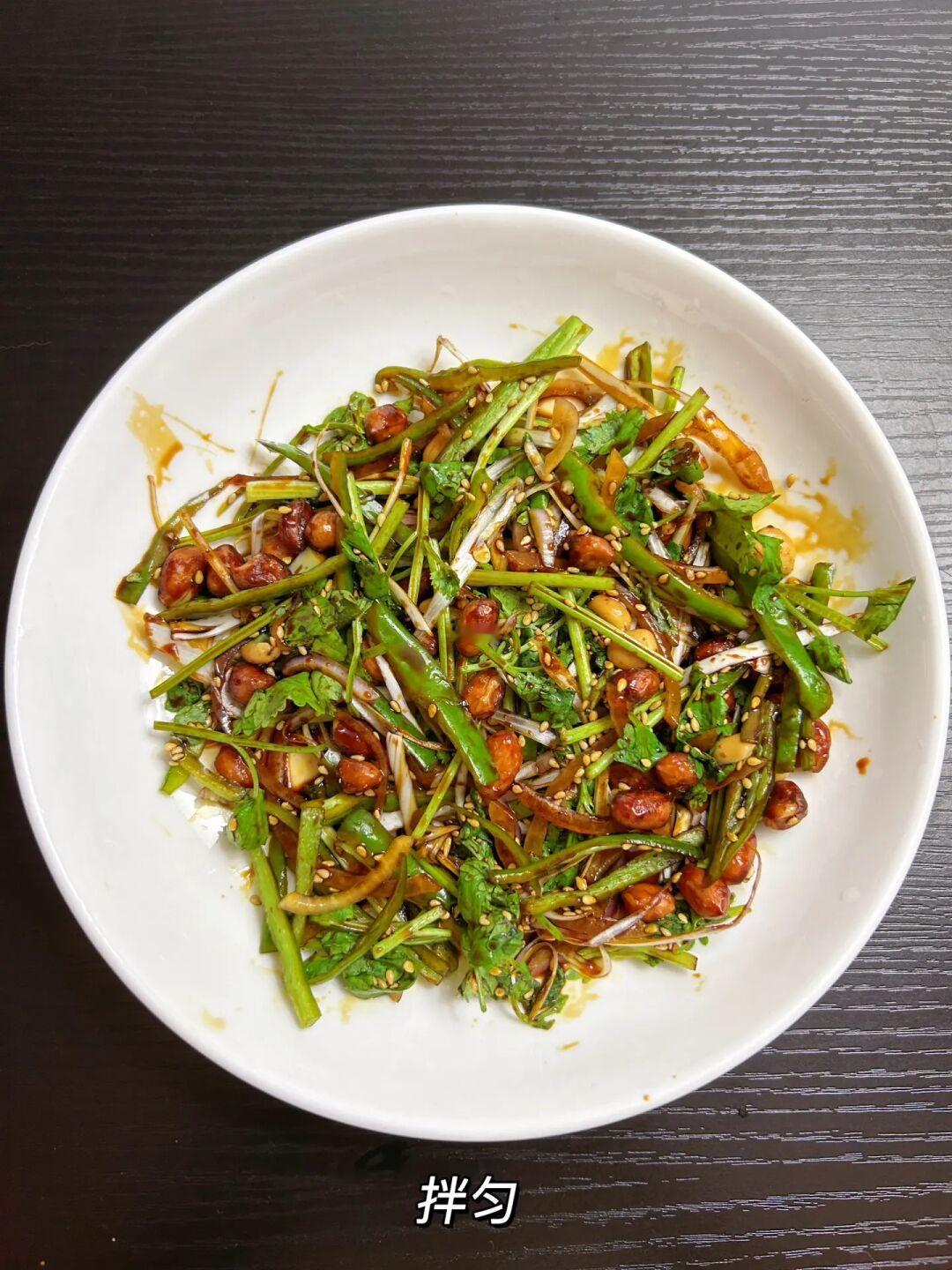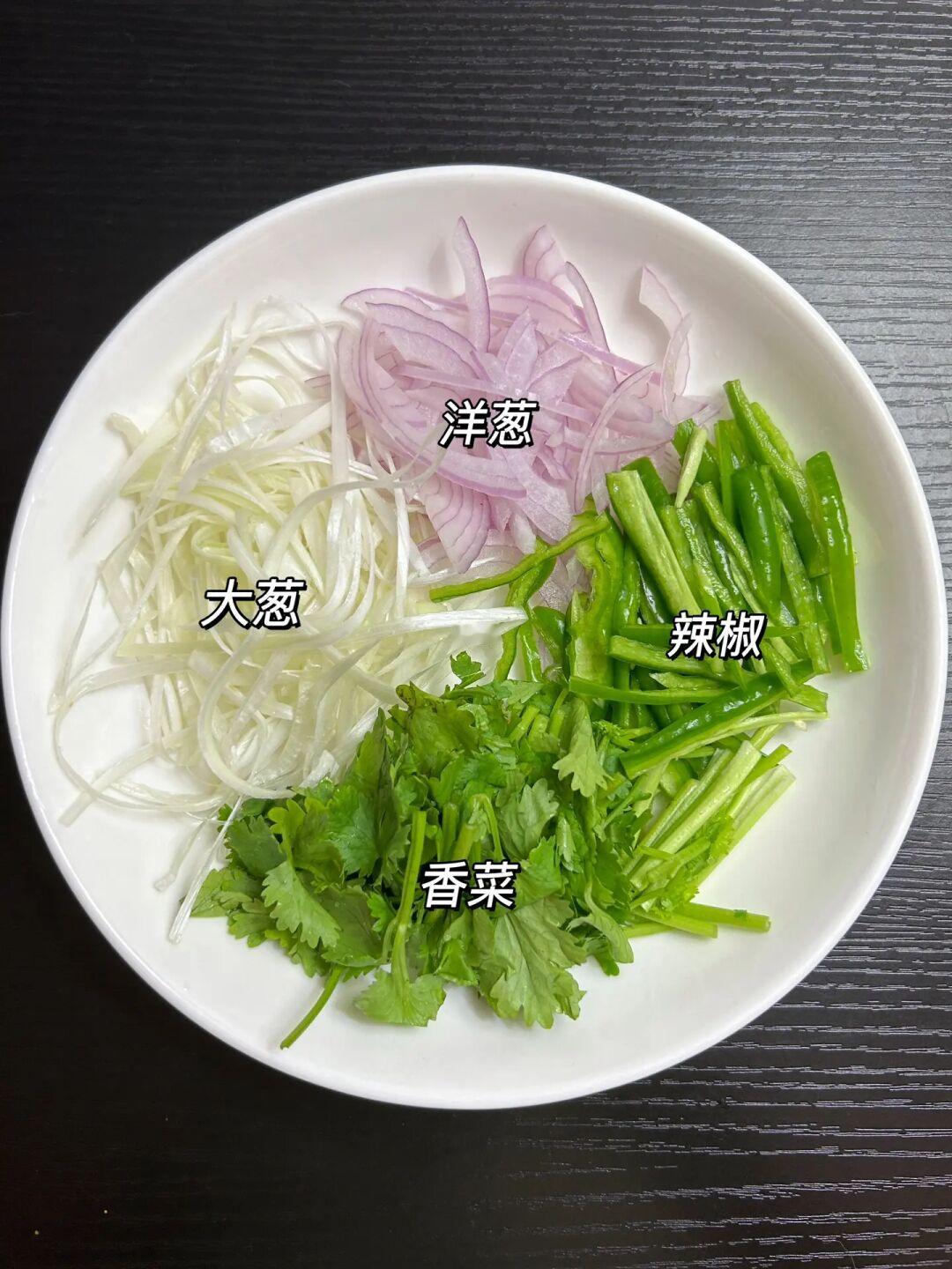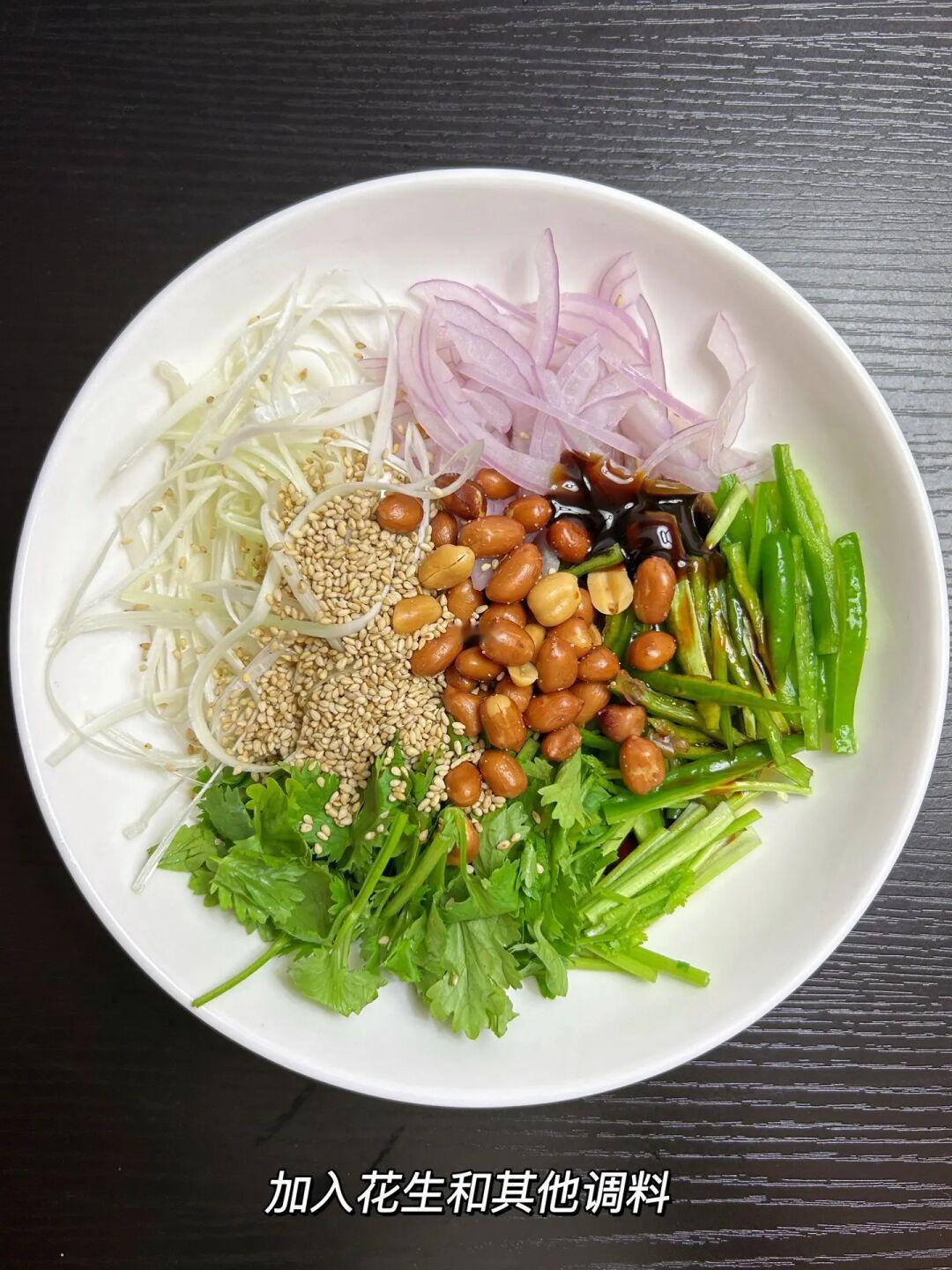 这个小拌菜真的好吃 配上面条吃真的好绝!! 1⃣️大葱、洋葱、辣椒切丝,香菜切碎,一起装盘 2⃣️加入花生米、白芝麻、1勺生抽、1勺蚝油、1勺香醋、1勺香油拌匀 完成✅ 特别清爽!!