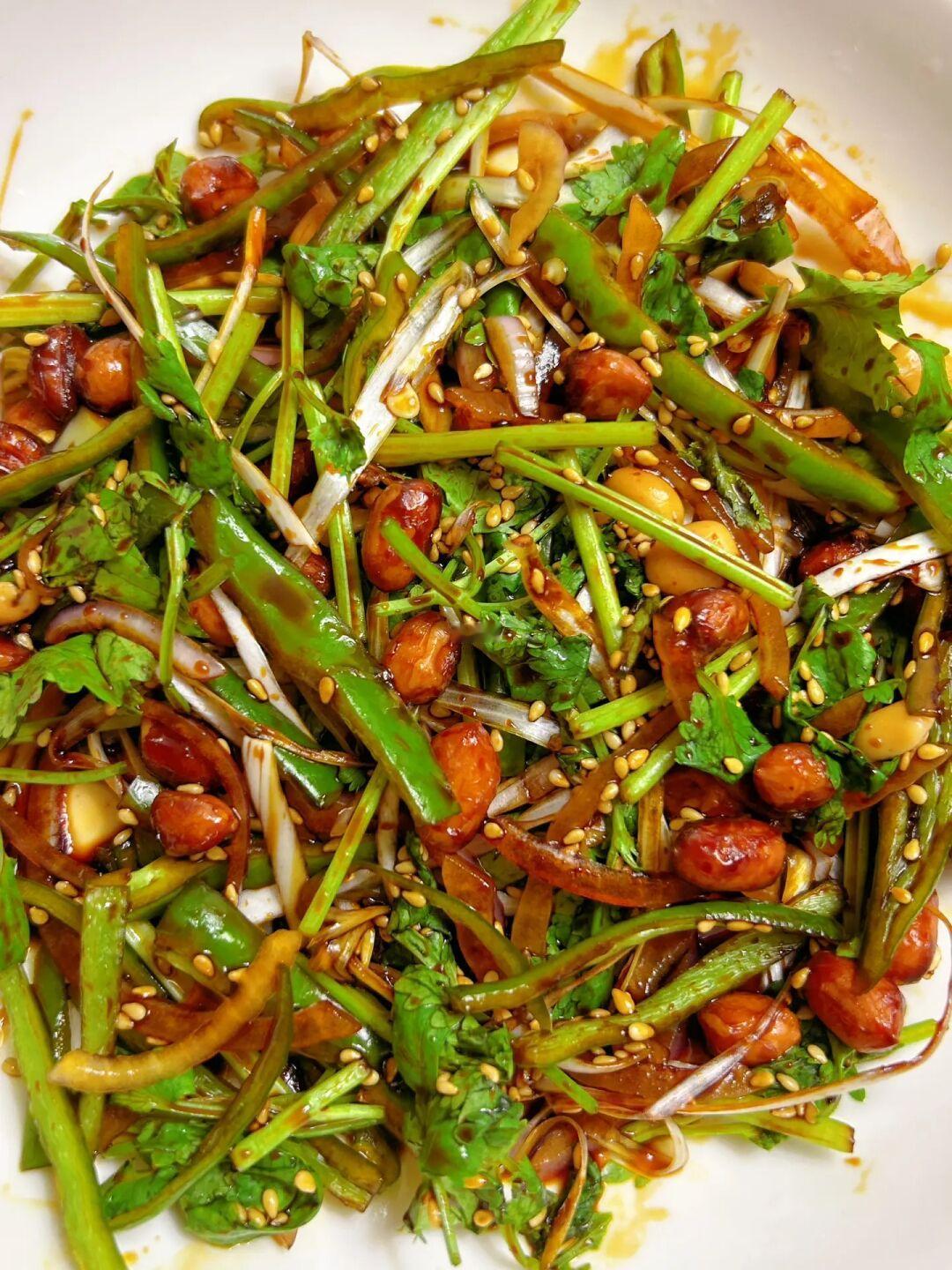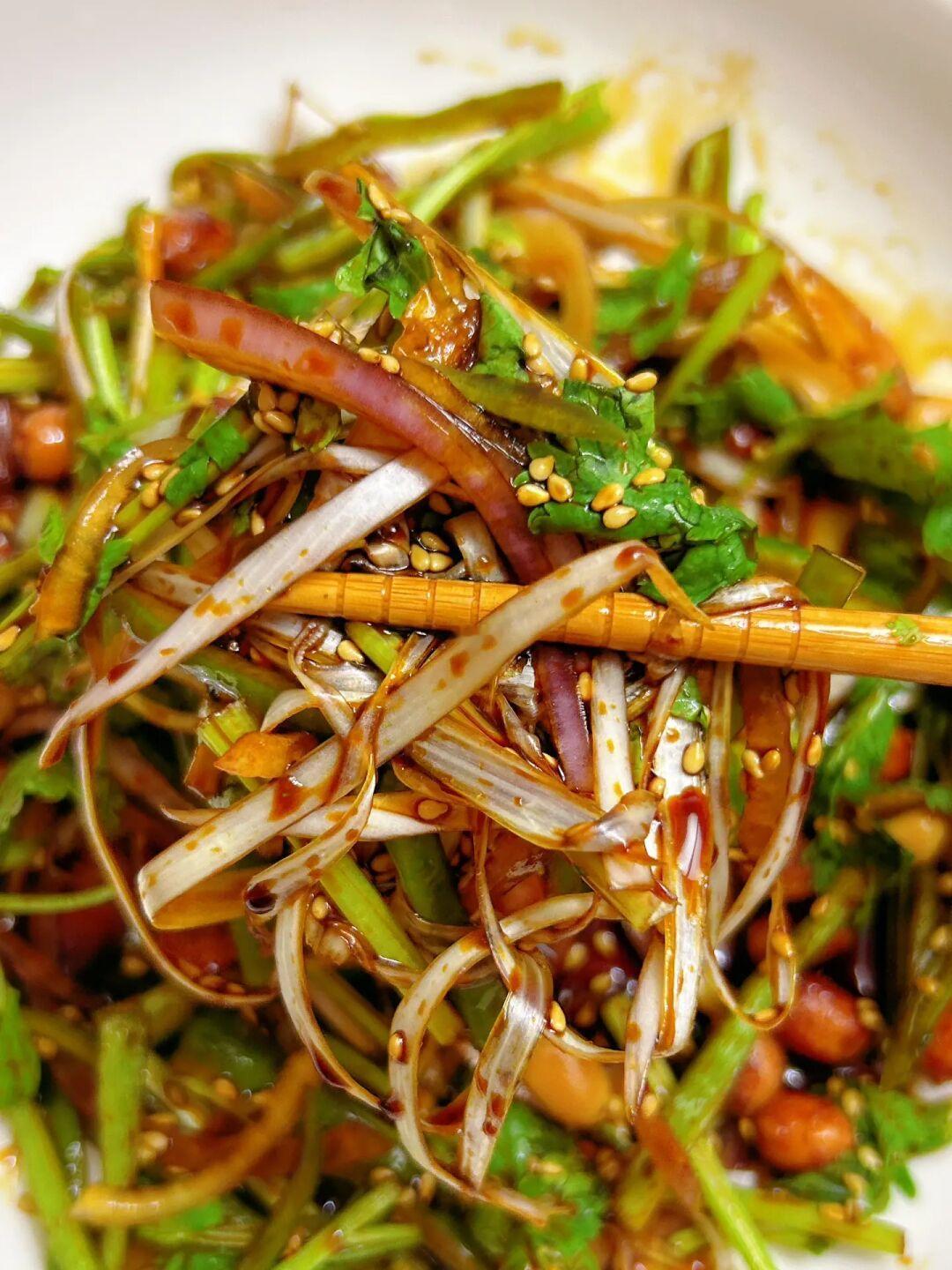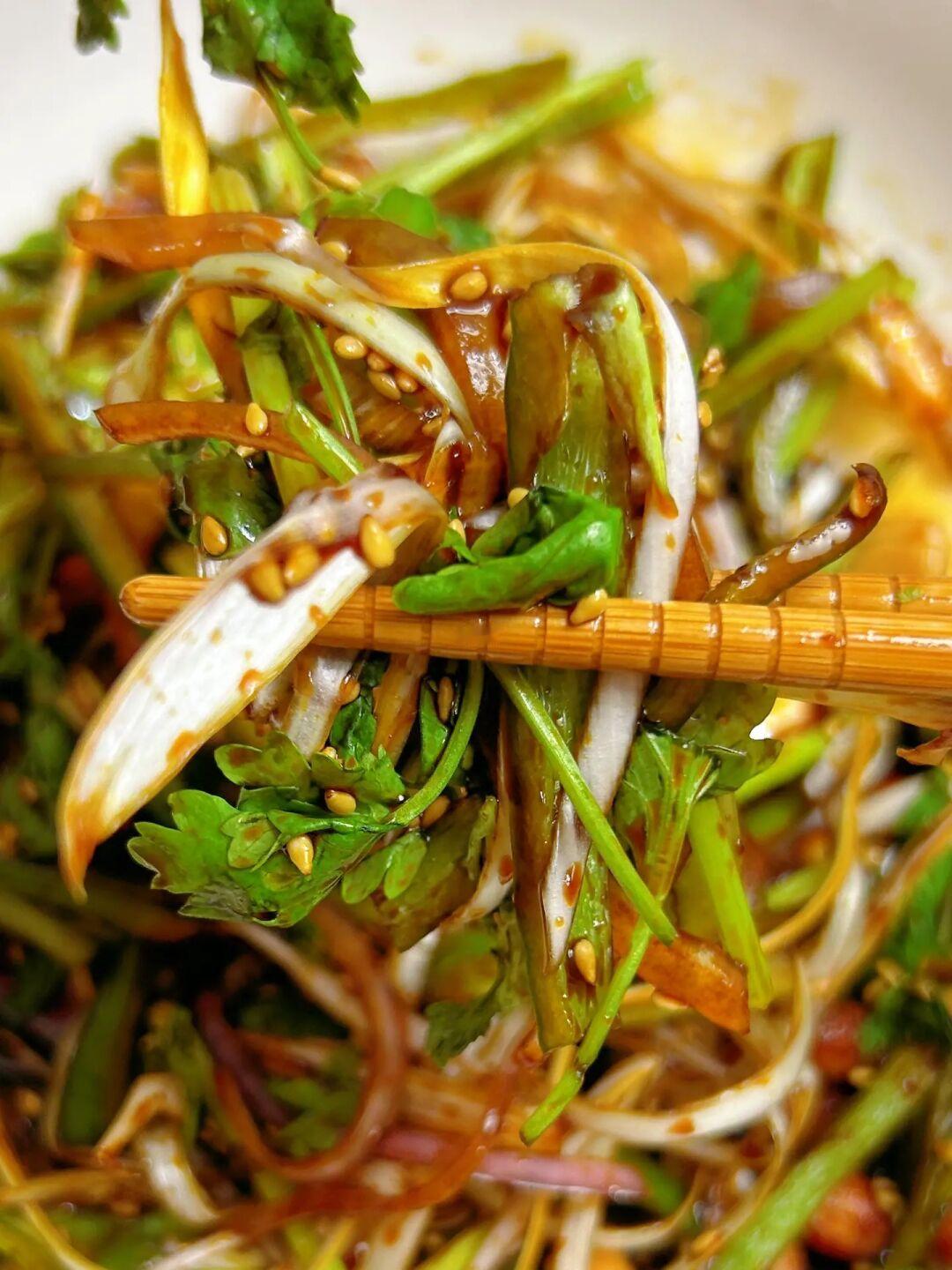 这个小拌菜真的好吃 配上面条吃真的好绝!! 1⃣️大葱、洋葱、辣椒切丝,香菜切碎,一起装盘 2⃣️加入花生米、白芝麻、1勺生抽、1勺蚝油、1勺香醋、1勺香油拌匀 完成✅ 特别清爽!!