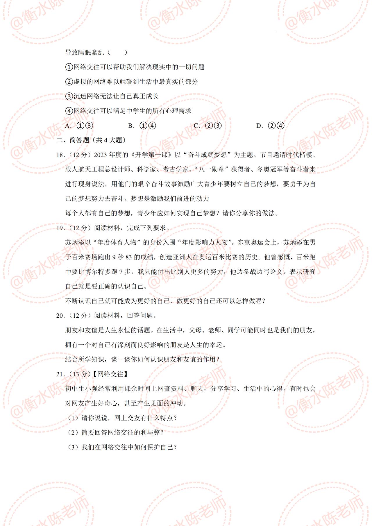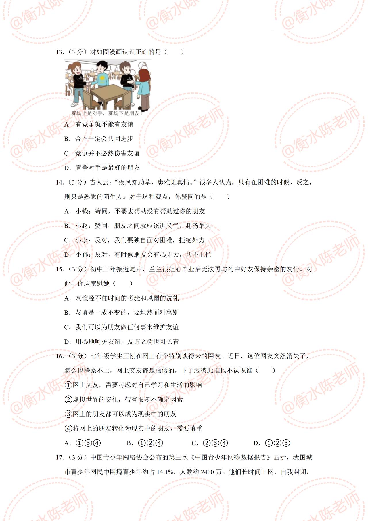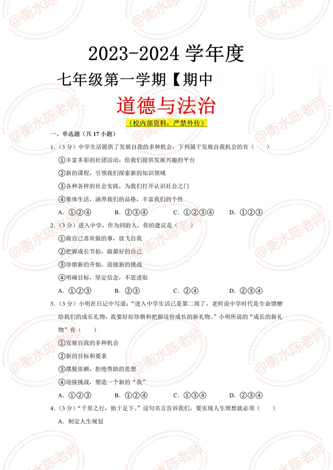 七年级道德与法治上学期,期中考试常考、热点考题,都在这套试卷里面哦,考题根据不同的城市、版本,编写的重点考题,想要考出好成绩,记得跟我提前沟通哦。