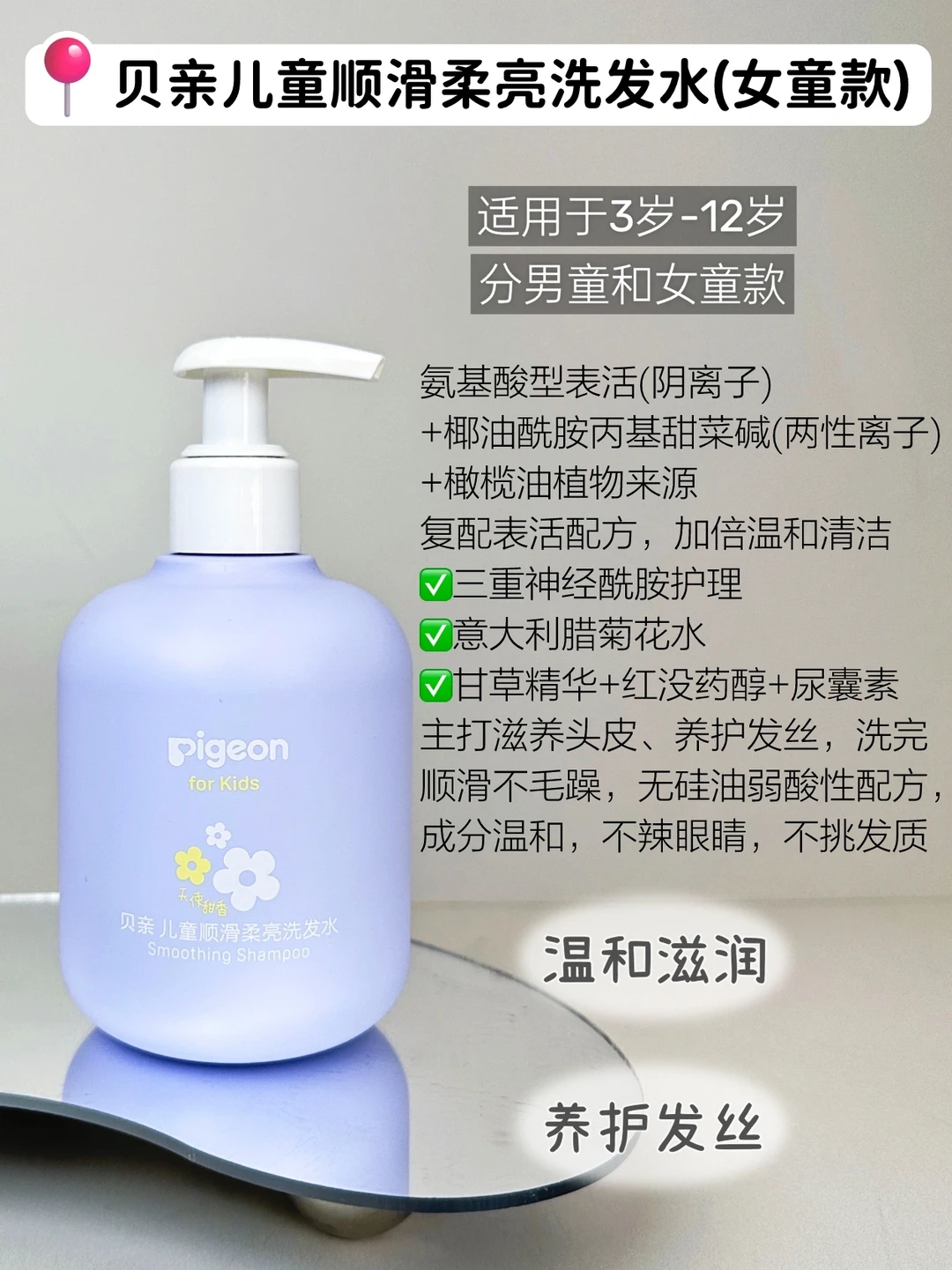 🟣贝亲:不挑发质,温和滋润,养护发丝。还分有男女童款,男款清洁力强,女款护发力强。这款紫色的是女宝款,滋养度拉满,添加了5种护发成分,给孩子用很温和,且清洁度恰好