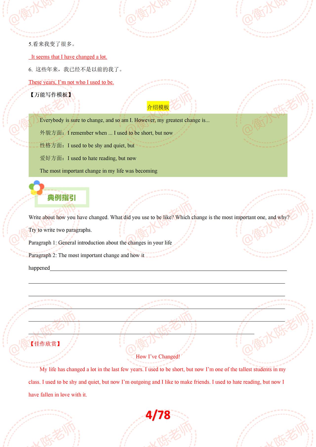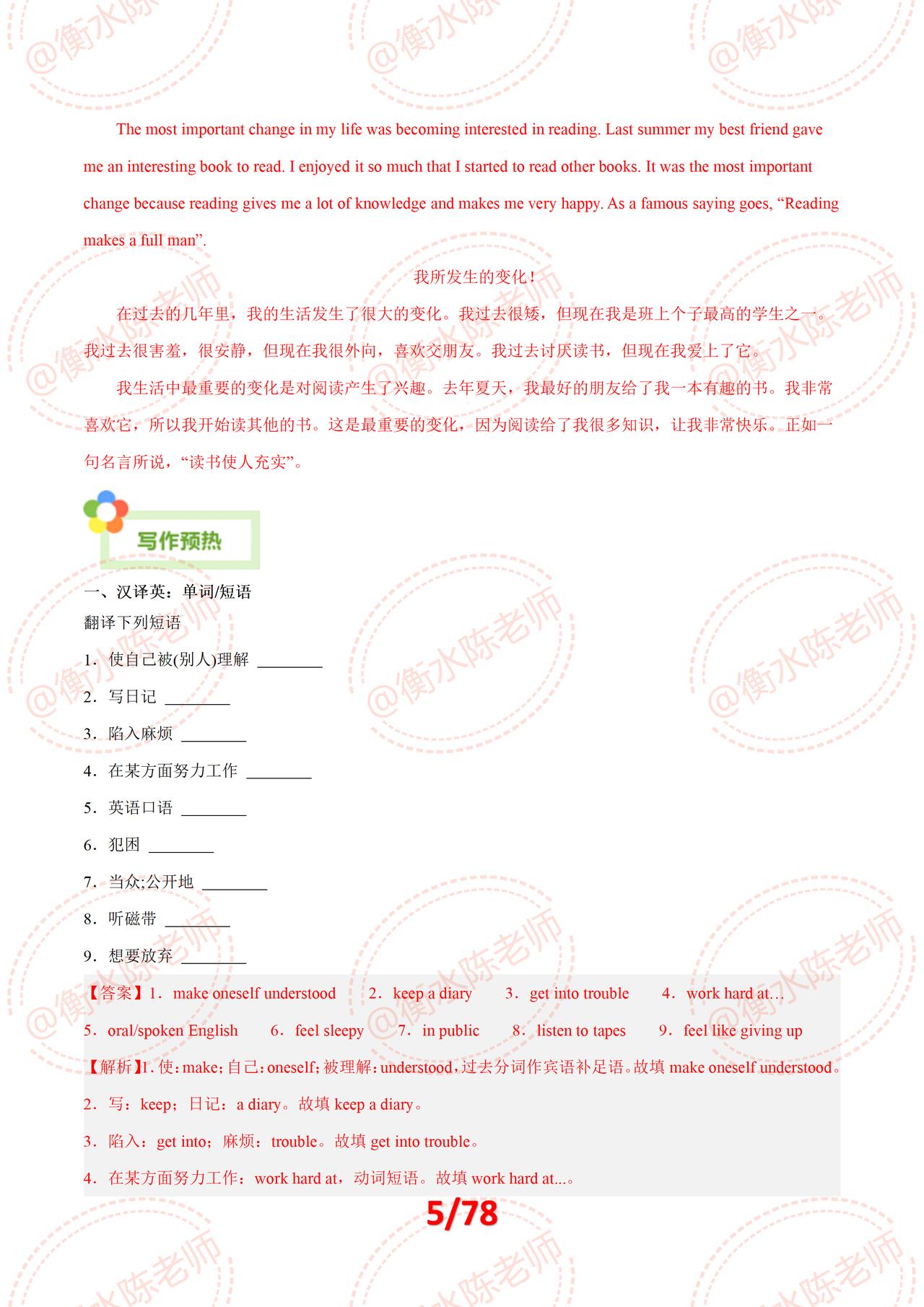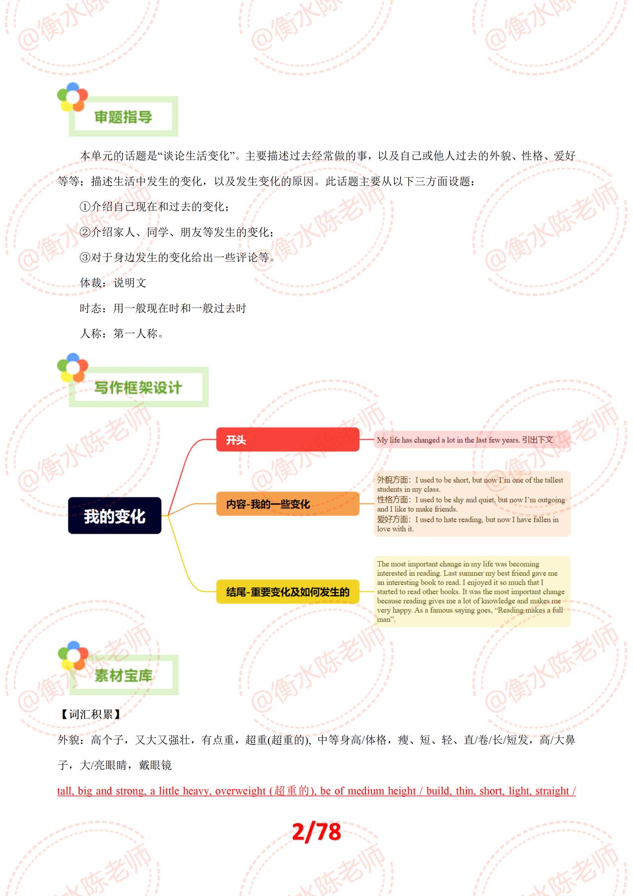 大家好!今天为大家带来的是九年级上学期英语各单元必背优秀满分作文范文! 那么,如何高效地背诵范文呢?下面就为大家分享一些实用的方法和技巧。 首先,要选择优秀的范文。在选择范文时,一定要选择具有代表性的、语言优美的、结构严谨的、符合考试要求的范文。这样不仅可以提高背诵效率,还能够更好地掌握英语写作的技巧。 其次,要有针对性地背诵。针对自己薄弱的环节,选择相应的范文进行重点背诵。例如,如果你的作文结构不够严谨,可以选择一些结构清晰的范文进行重点背诵;如果你的语言表达不够流畅,可以选择一些语言优美的范文进行模仿练习。 最后,要注重实践。背诵范文只是第一步,更重要的是将所学到的知识应用到实践中。在平时的练习中,可以尝试将自己背诵的范文进行改编或者仿写,逐渐提高自己的写作水平。 希望同学们能够认真学习,认真背诵满分作文,不断提高自己的英语写作水平,为中考取得好成绩打下坚实的基础!