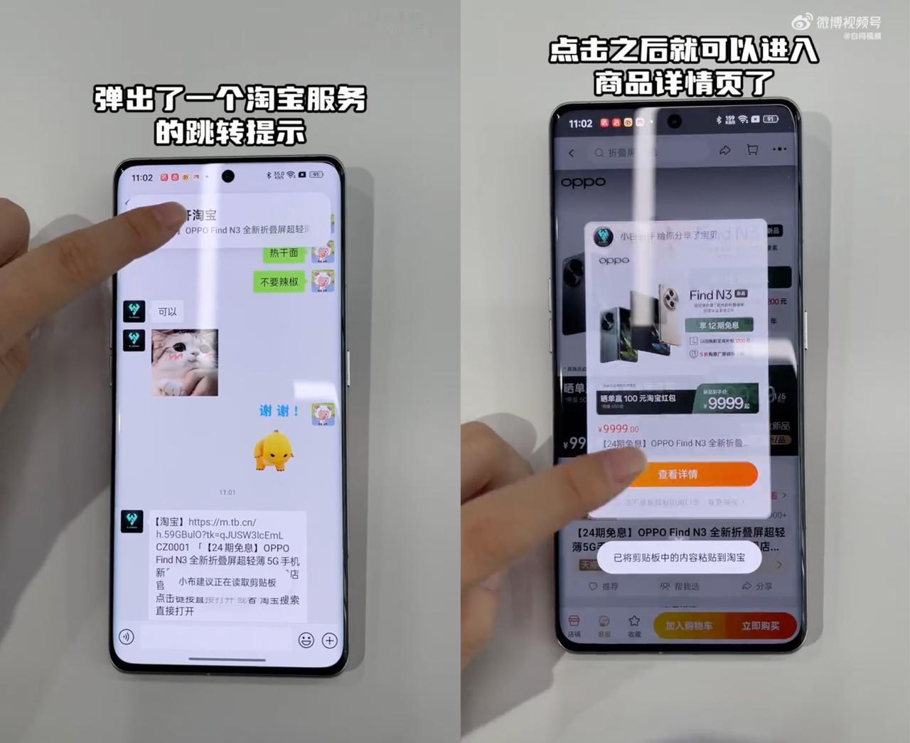 啥时候微信才能一键跳转某宝功能?每次收到好友分享的某宝链接,都要一个个手动复制,再切换到某宝打开也太麻烦了?而且有时候明明复制了链接,但某宝就是没有弹窗,还需要自己再去手动去搜索,一顿操作下来确实很费事。 不过现在国产手机厂商终于出手了,OPPO刚发布的ColorOS 14系统中,就新增了一个个「流体云」功能,用起来很方便。比如博主白问视频在微信复制了某宝的链接后,就会快速弹出一个浮窗,点击就能快速跳转到某宝界面,终于不用再复制、切换APP、点击等一顿操作了!而且除了这个功能以外,ColorOS 14系统的流体云功能还能识别其他链接,并跳转到相应的界面中,主打的就是一个方便!而即将发布的#OPPO Reno11#系列,就将首发搭载ColorOS 14系统,不妨期待一下。
