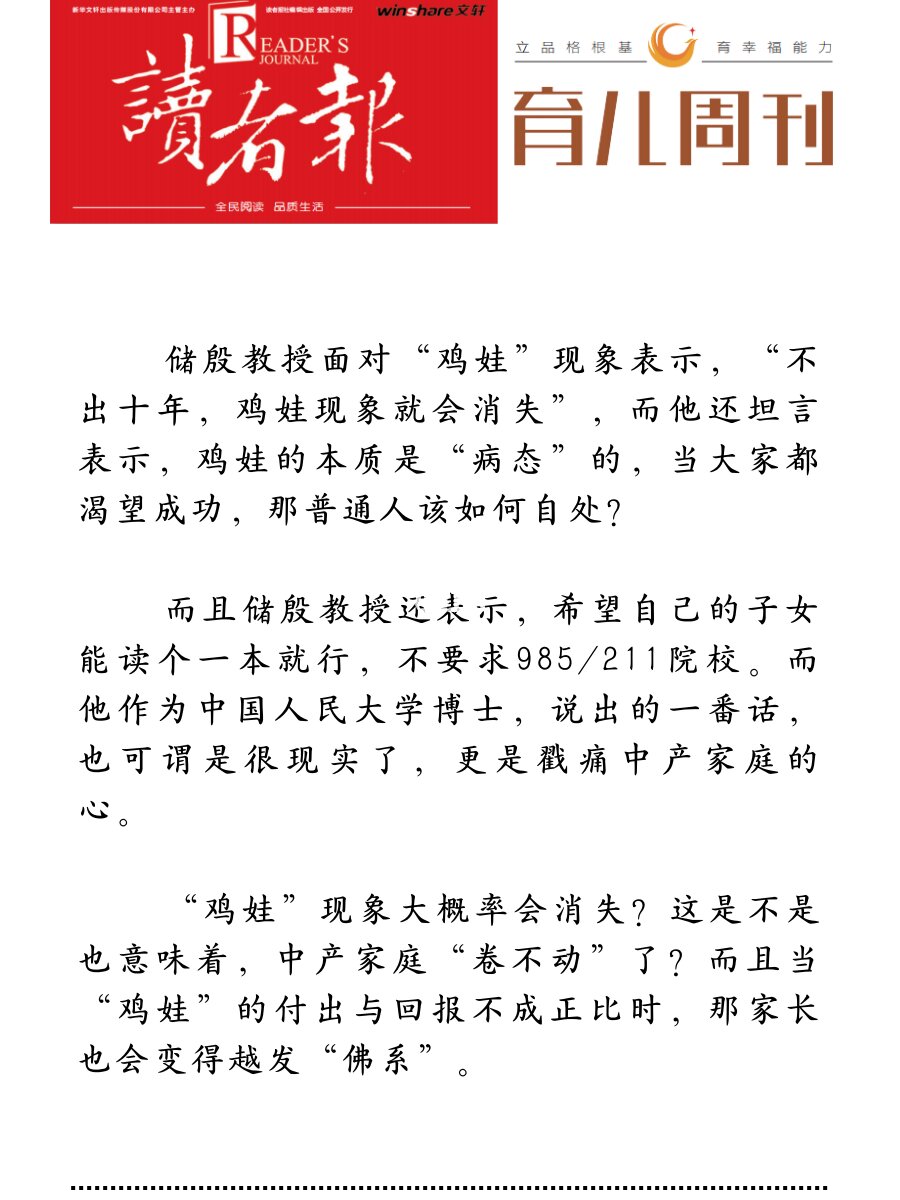 储殷教授面对“鸡娃”现象表示,“不出十年,鸡娃现象就会消失”,而他还坦言表示,鸡娃的本质是“病态”的,当大家都渴望成功,那普通人该如何自处?