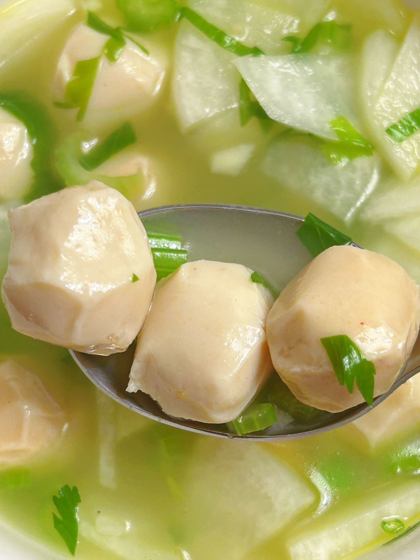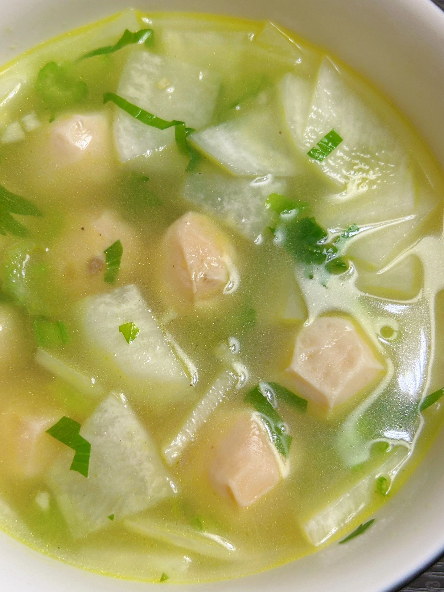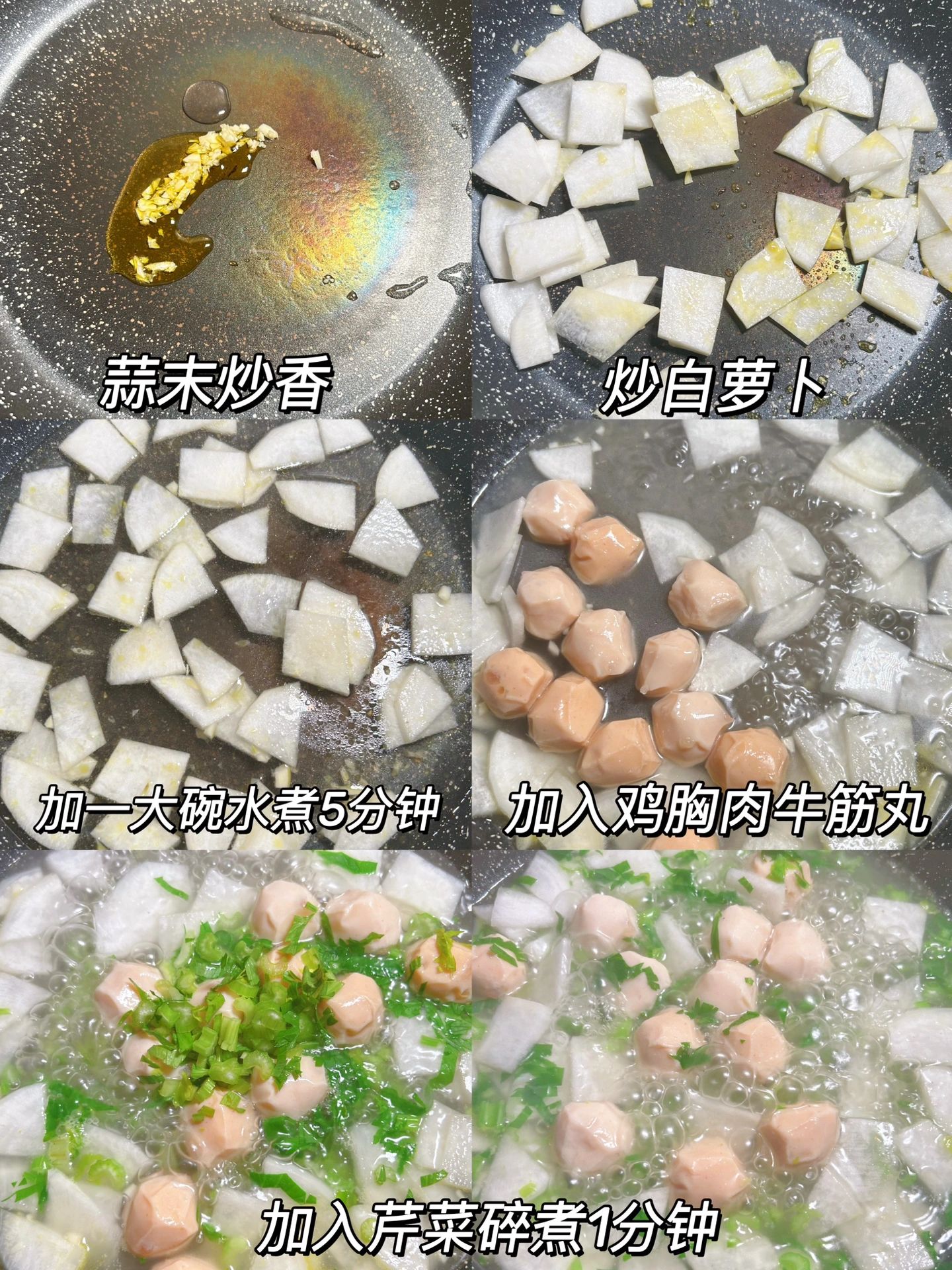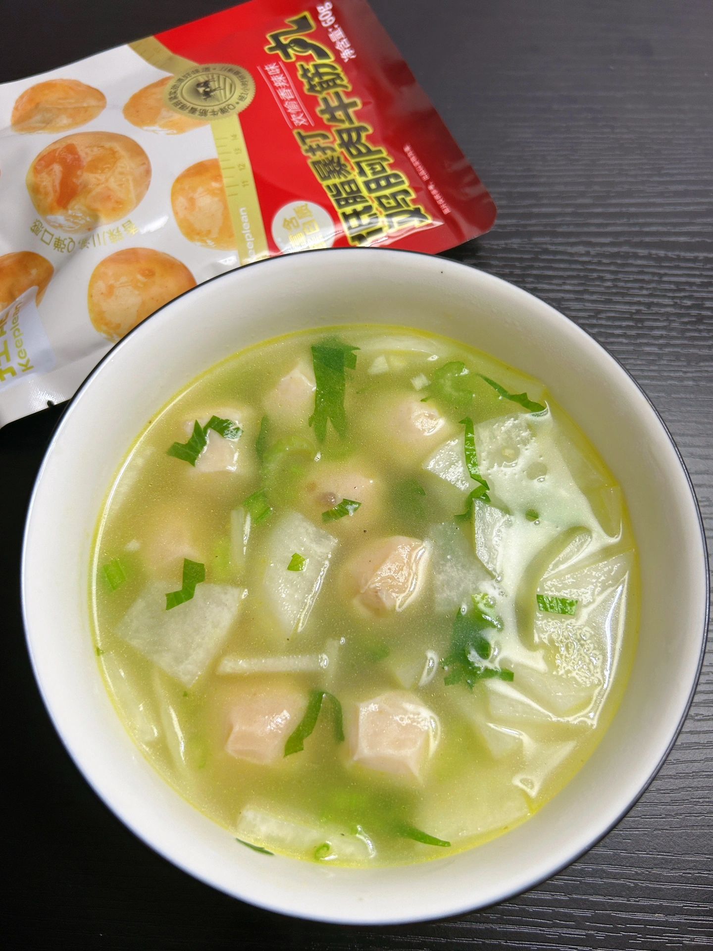 我妈做的这个,真的太好吃了!!!!! 冬天太适合这种暖暖的汤了! 鸡胸肉牛筋丸萝卜汤 低卡又温暖!! 1️⃣蒜末炒香,加入白萝卜片炒一下,加入一大碗水煮5分钟 2️⃣加入鸡胸肉牛筋丸,撒上芹菜碎煮1分钟出锅 完成✅ 太好喝啦!! 完全不担心长胖! 丸子用的控能家的鸡胸肉牛筋丸~ 暴打工艺,口感特别弹,完全不会柴。而且丸子里还加了大粒的牛筋,真材实料,很有嚼劲!每袋11.2g蛋白质,但是热量不到半个苹果,放进去做汤,低脂又美味!平时饿了也可以直接吃,太适合健身减肥的姐妹啦!