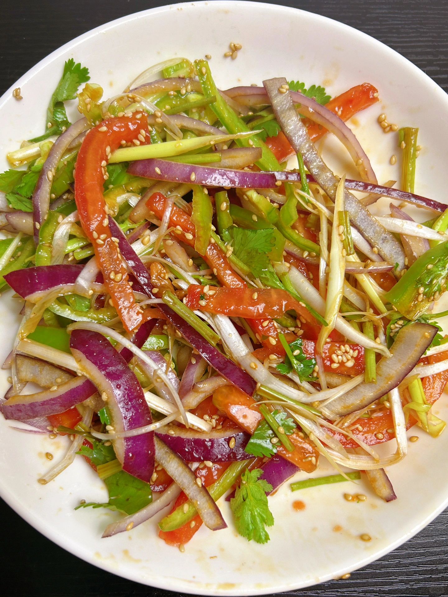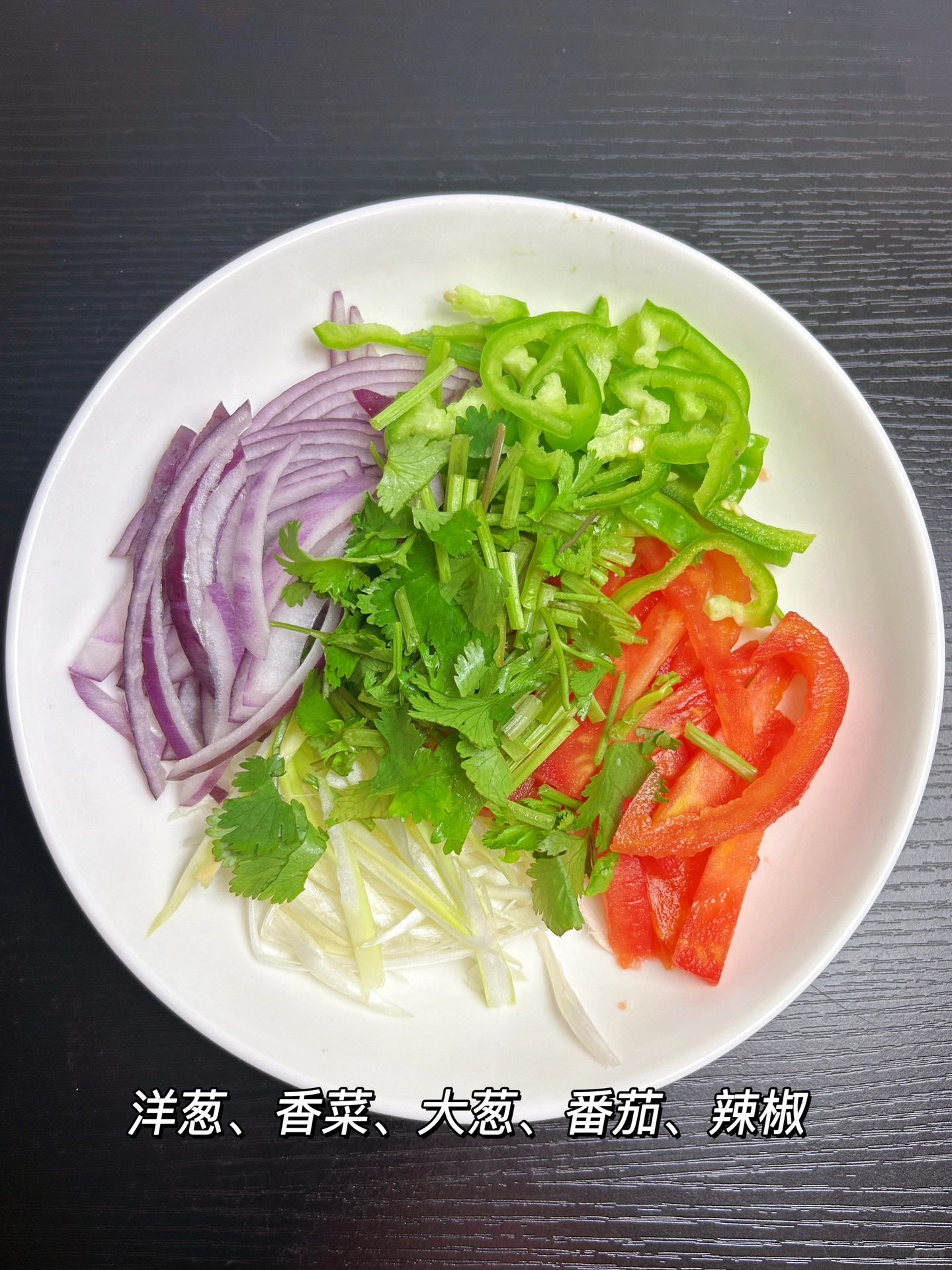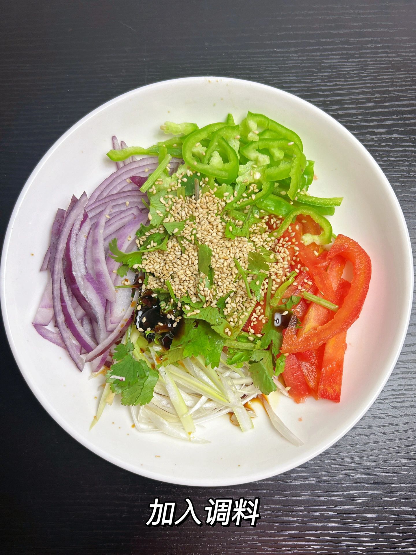 新疆叫皮辣红 真的好好吃 超清爽解腻 1⃣️洋葱、番茄、大葱、辣椒切成丝,加入香菜 2⃣️撒上白芝麻,加入1勺蚝油、1勺生抽、1勺香醋、1勺香油拌匀 完成✅ 配面条或者夹在馒头里都好吃! 姐妹们快去试试!!!