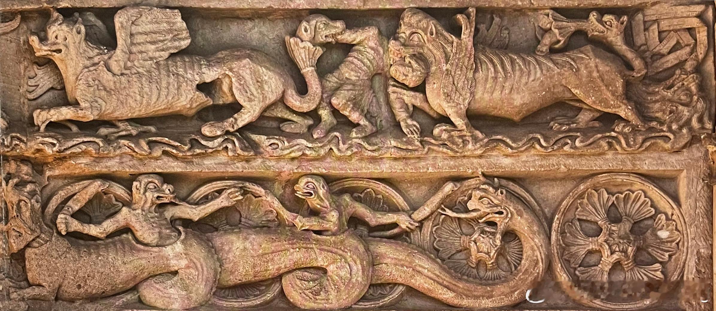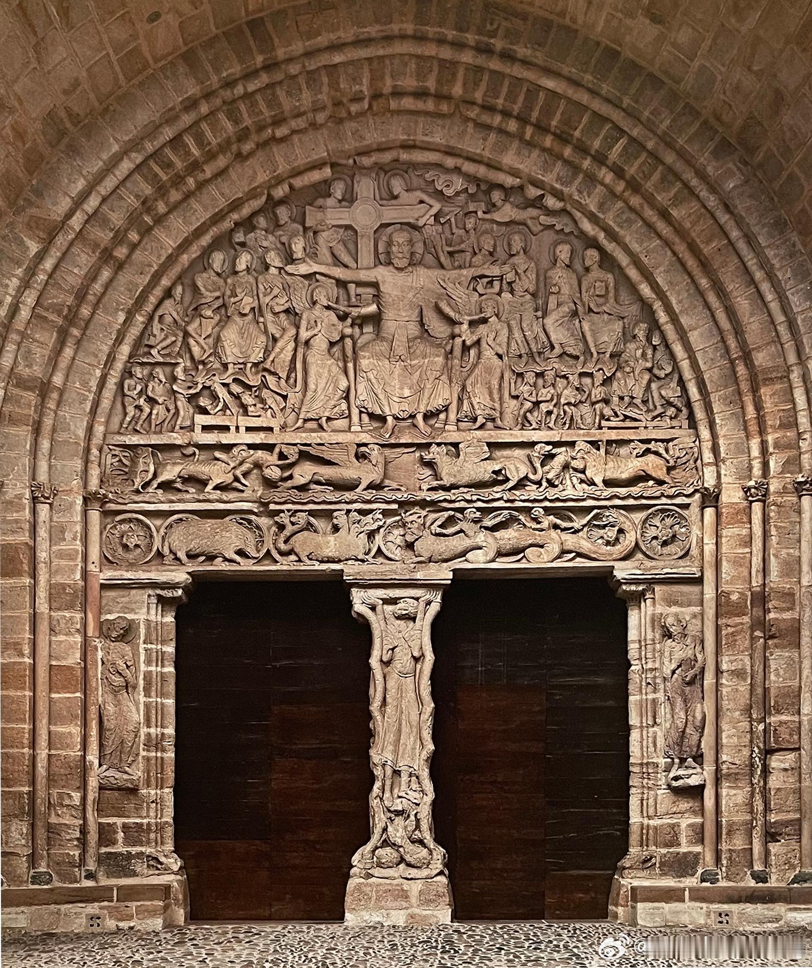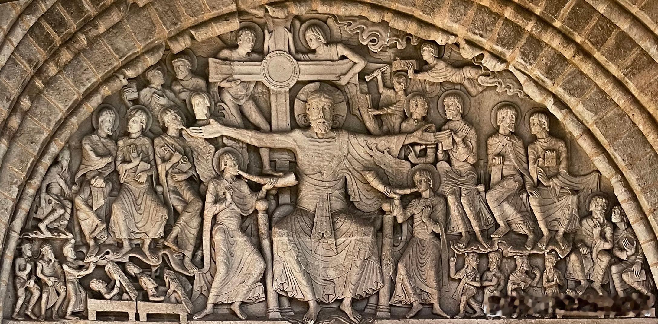 此外,审判者的冠冕在使徒聚集观看审判的那一刻,才由天使带来。他们脚下是围聚的罪人,有些人还从坟墓中起身。两层楣梁的下层有恶魔般的生物,包括《启示录》所提到的七头怪兽:上层中央有两个面对面的有翼混种生物,它们身后的两个人被从地狱血口出现的野兽吞噬。这是整幅图像中意义最模糊的细节,因为似乎抵触了基督再临的主题。