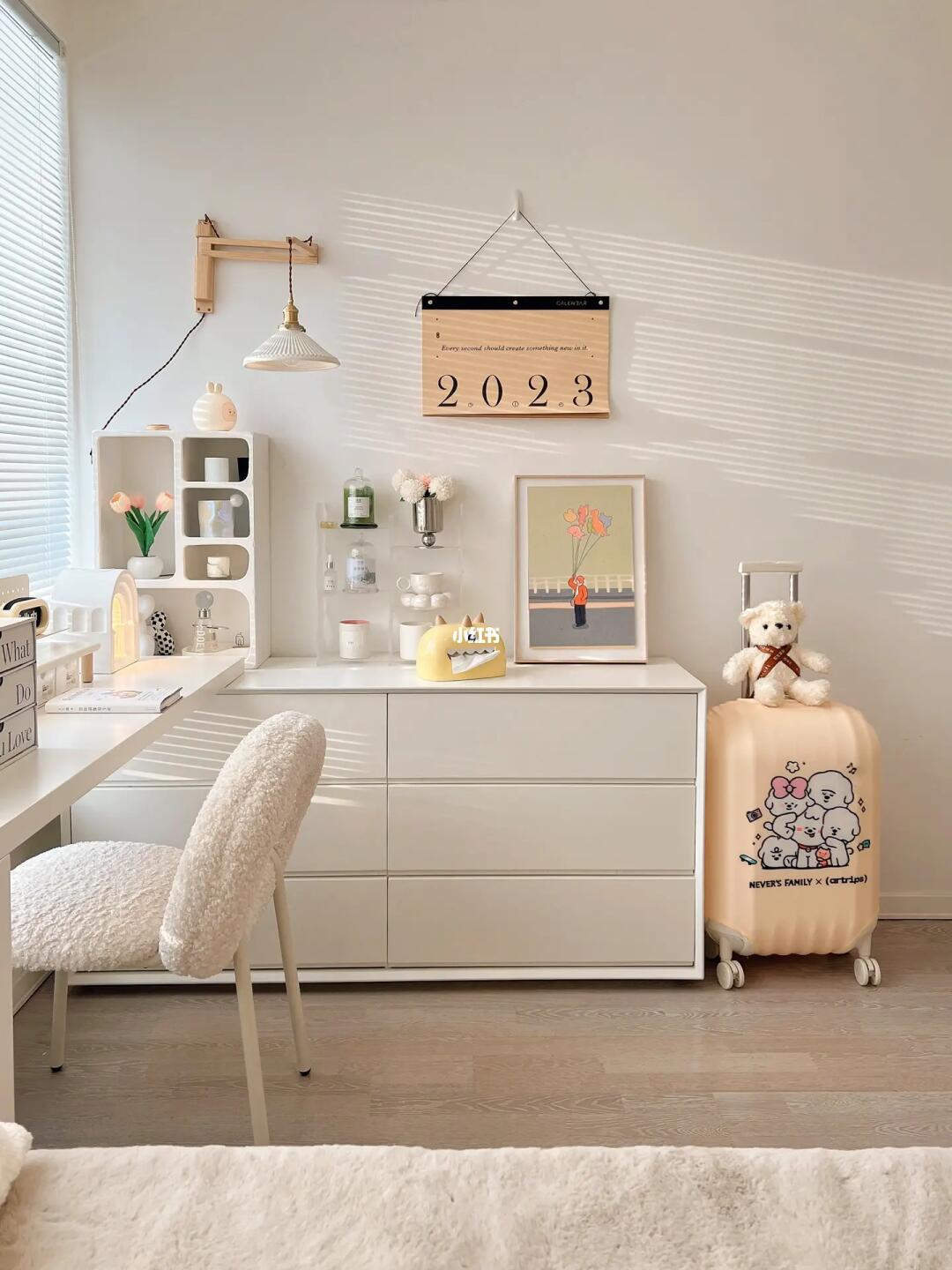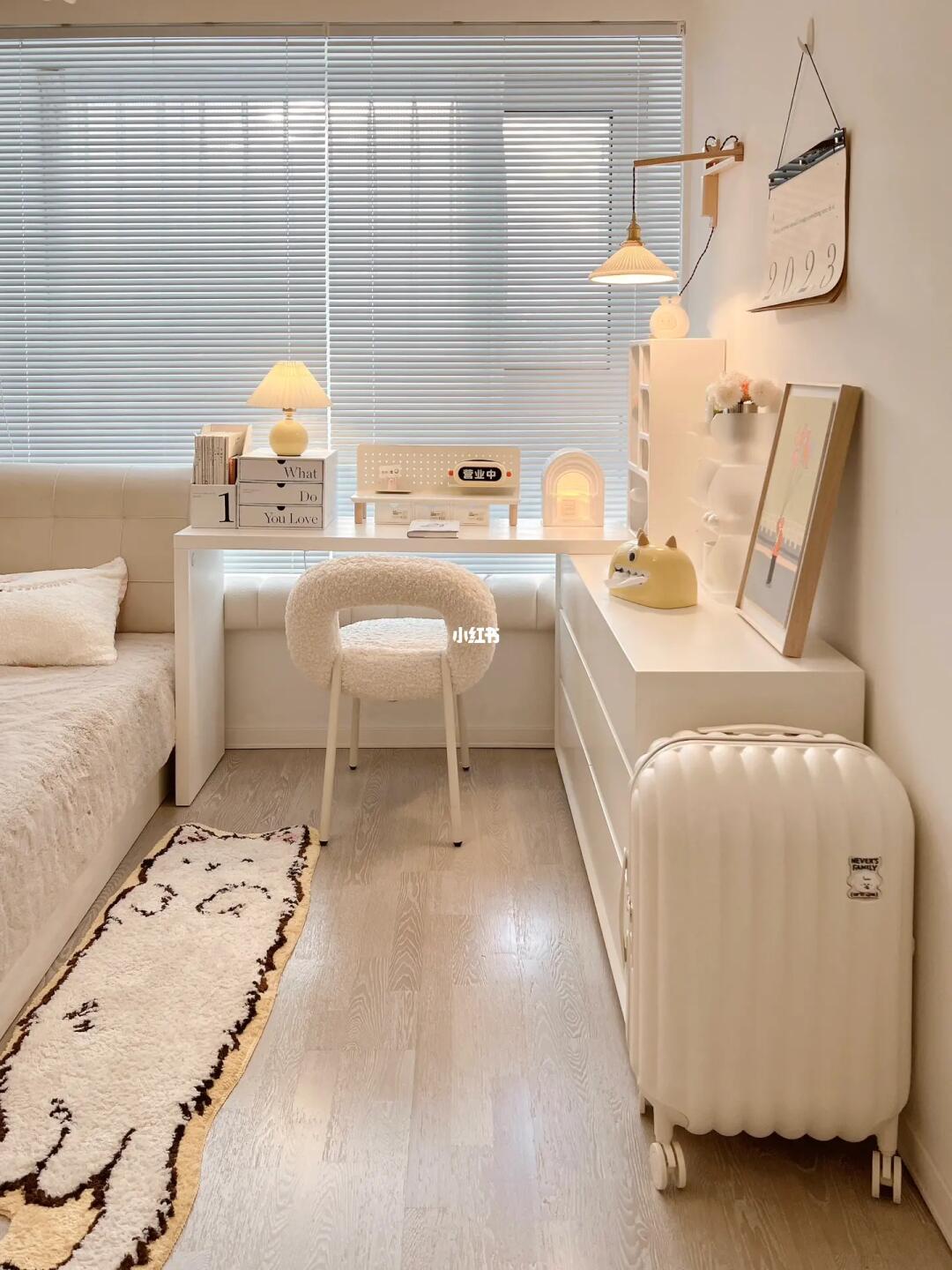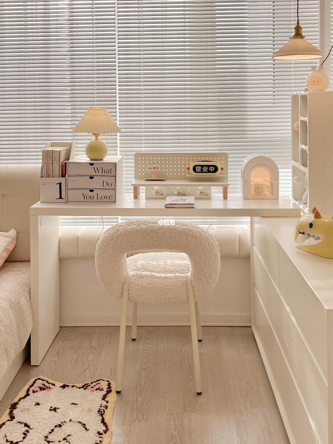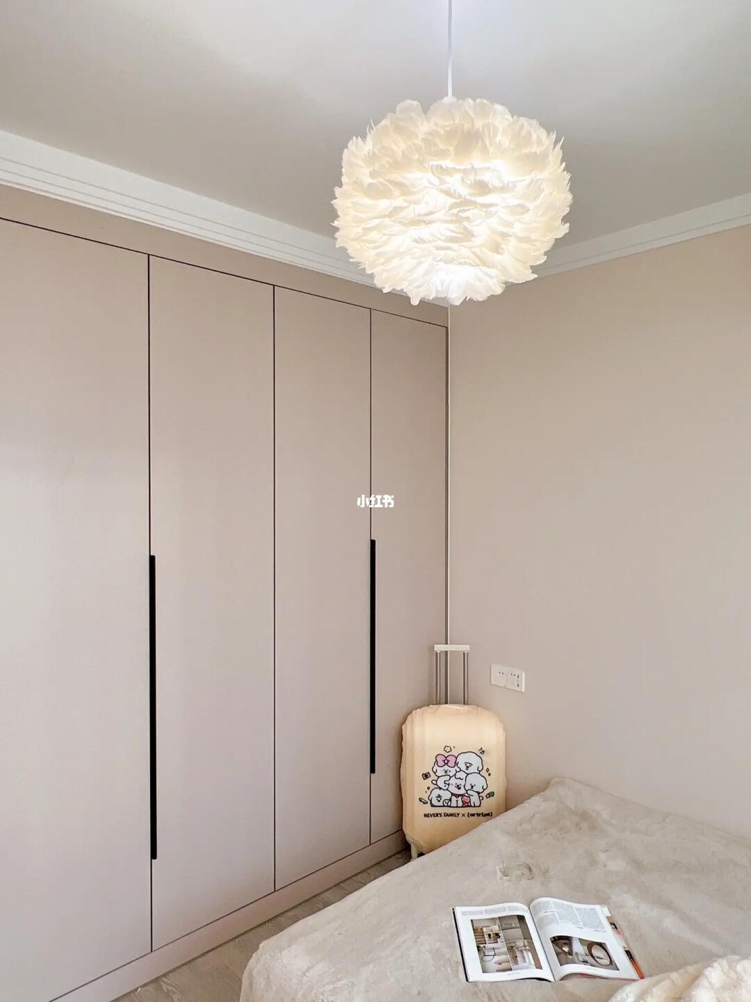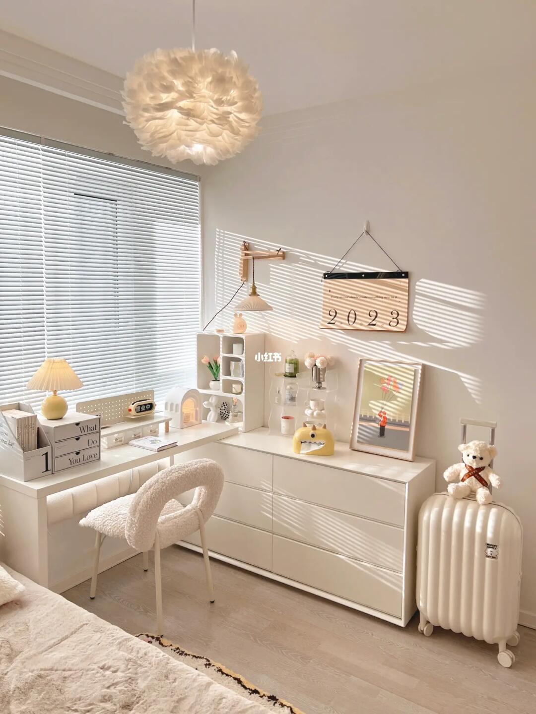 房间布置我都用的浅色,桌子柜子都用的白色,房间灯用的羽毛灯,简约又好看,显得敞亮