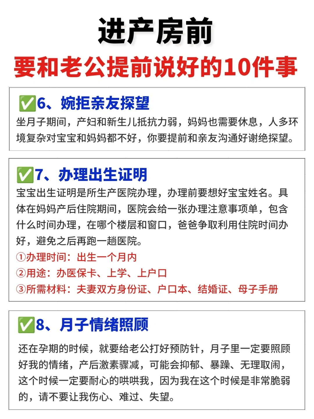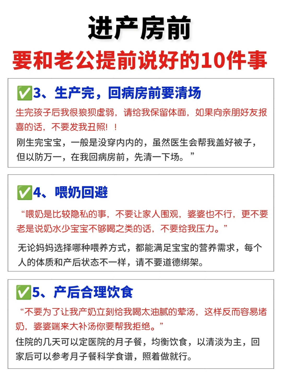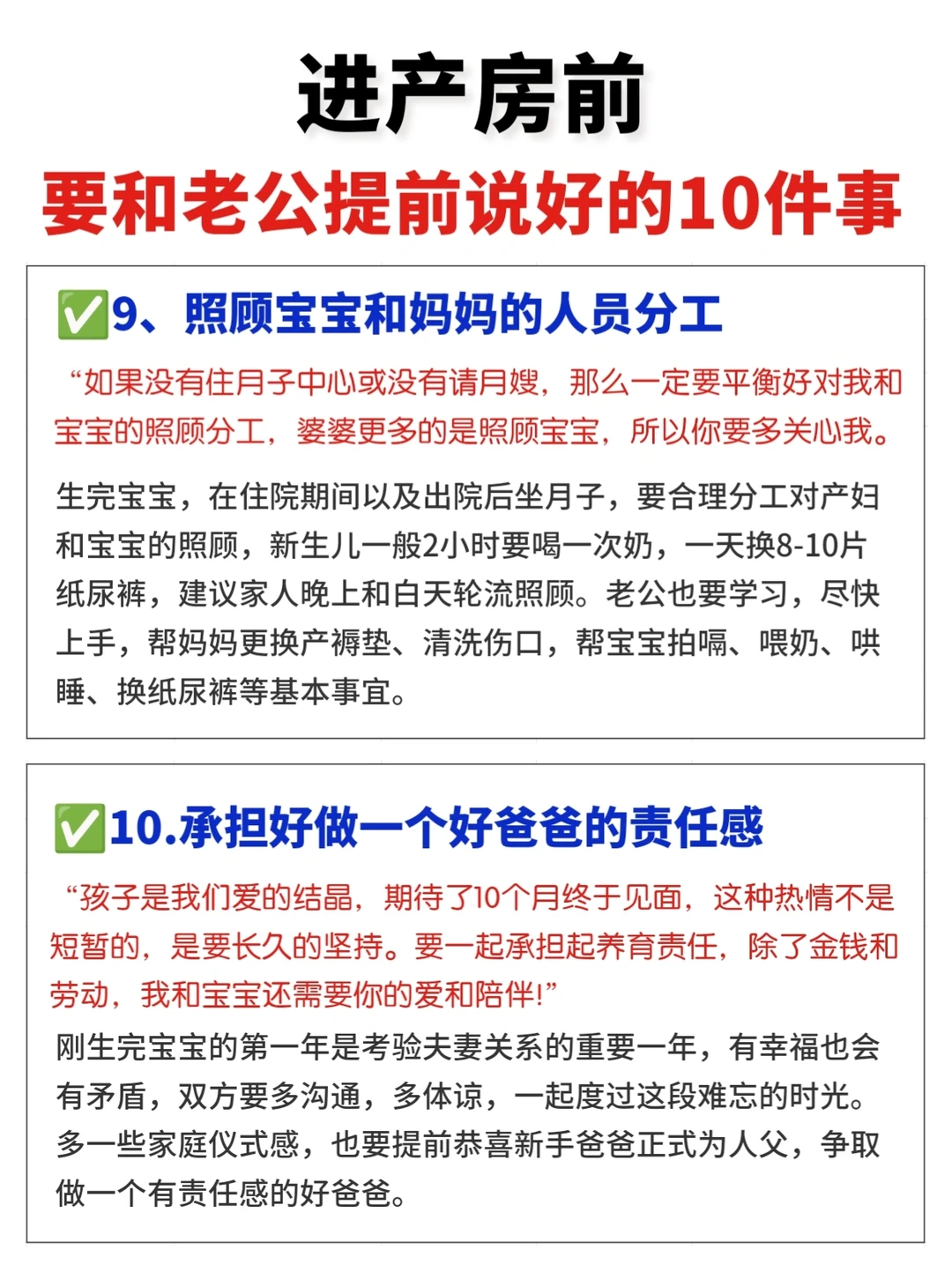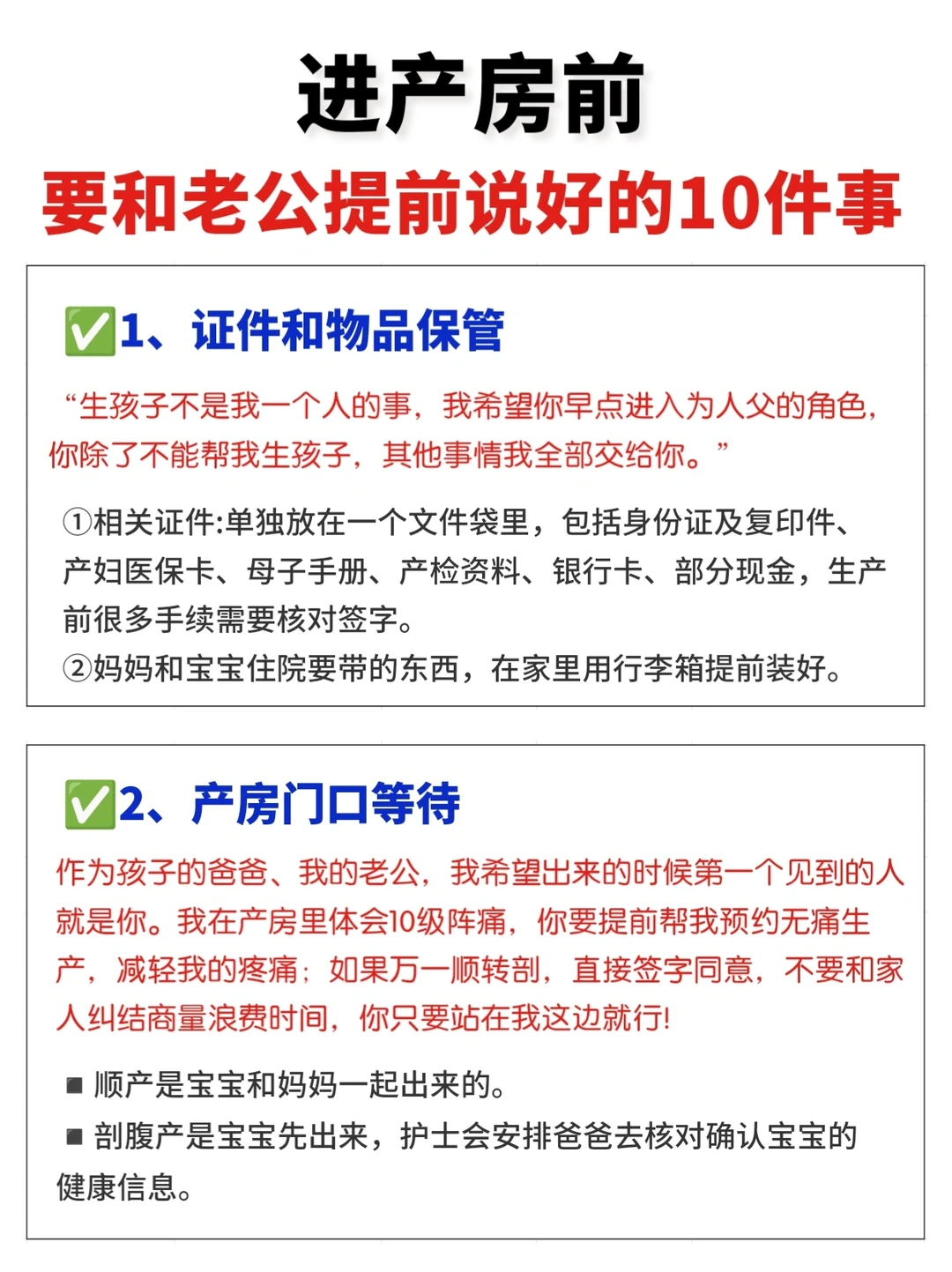 十月辛苦怀胎,终于熬到了分娩的时刻,但是孕妈妈们在进产房之前,一定要和老公提前沟通好一些问题,不仅可以减少临产前的焦虑,更有利于产后一家人的和谐! ✅孕妈和准爸爸要提前了解产程,做好待产准备 ✅提前学好照顾产妇和新生儿的知识,避免手忙脚乱 1⃣️保管好证件和物品 2⃣️一定要全程在产房外等待 3⃣️病房清场 4⃣️喂奶回避 5⃣️产后合理饮食 6⃣️谢绝亲友探望 7⃣️办理出生证明 8⃣️月子情绪照顾 9⃣️产后分工 1⃣️0⃣️承担爸爸的责任 · 好啦,希望所有孕妈都顺利生产哦! ·